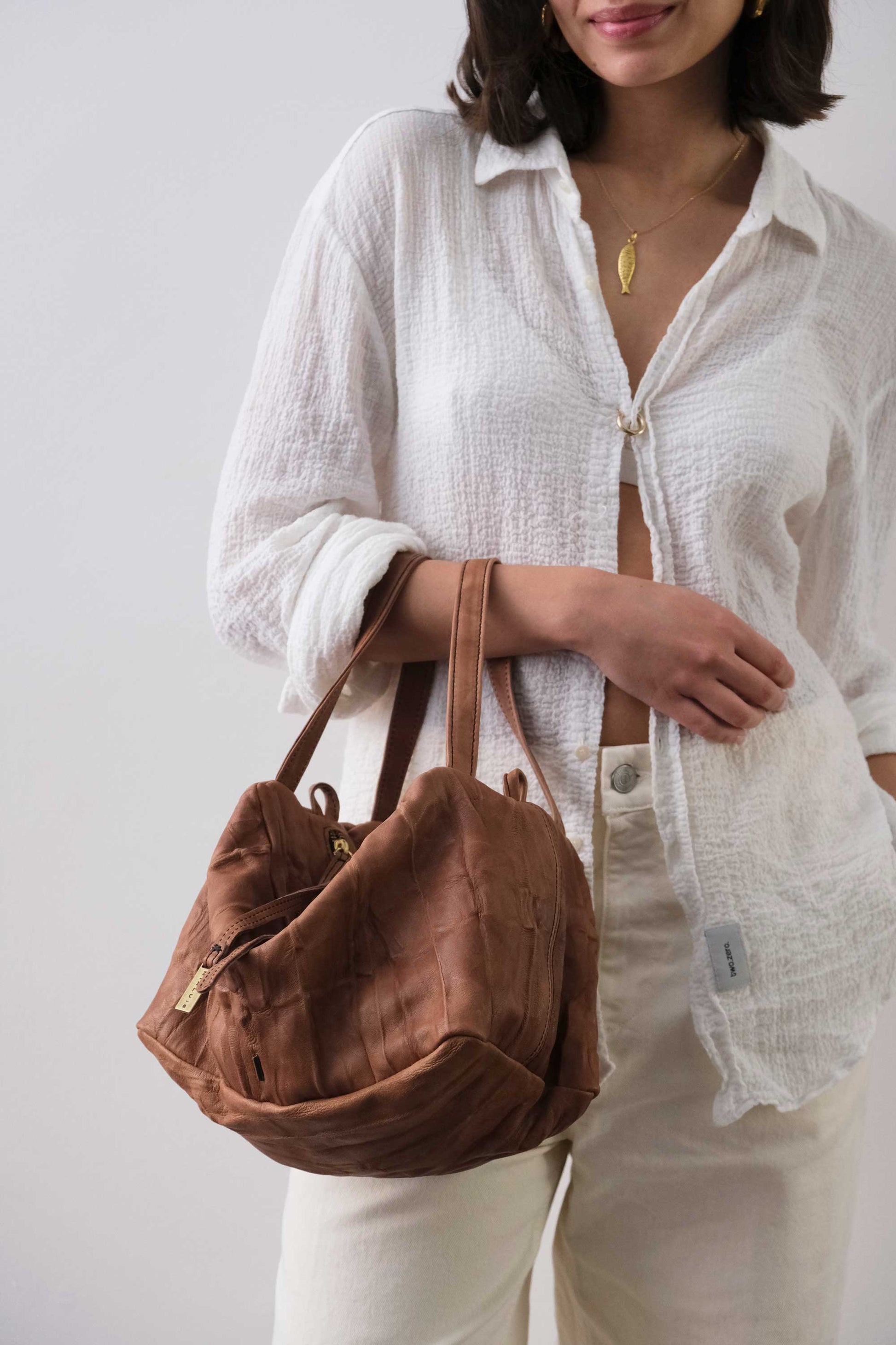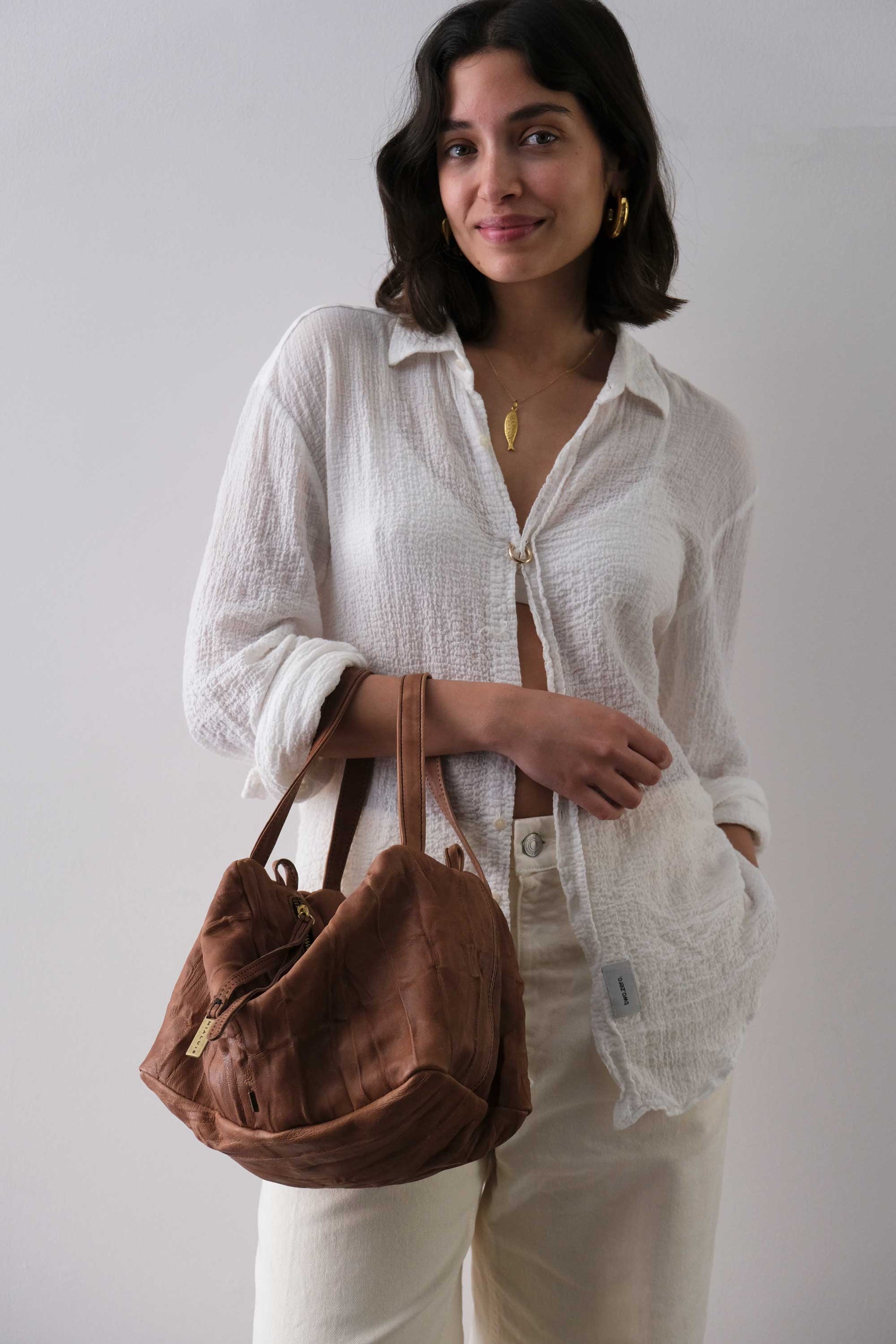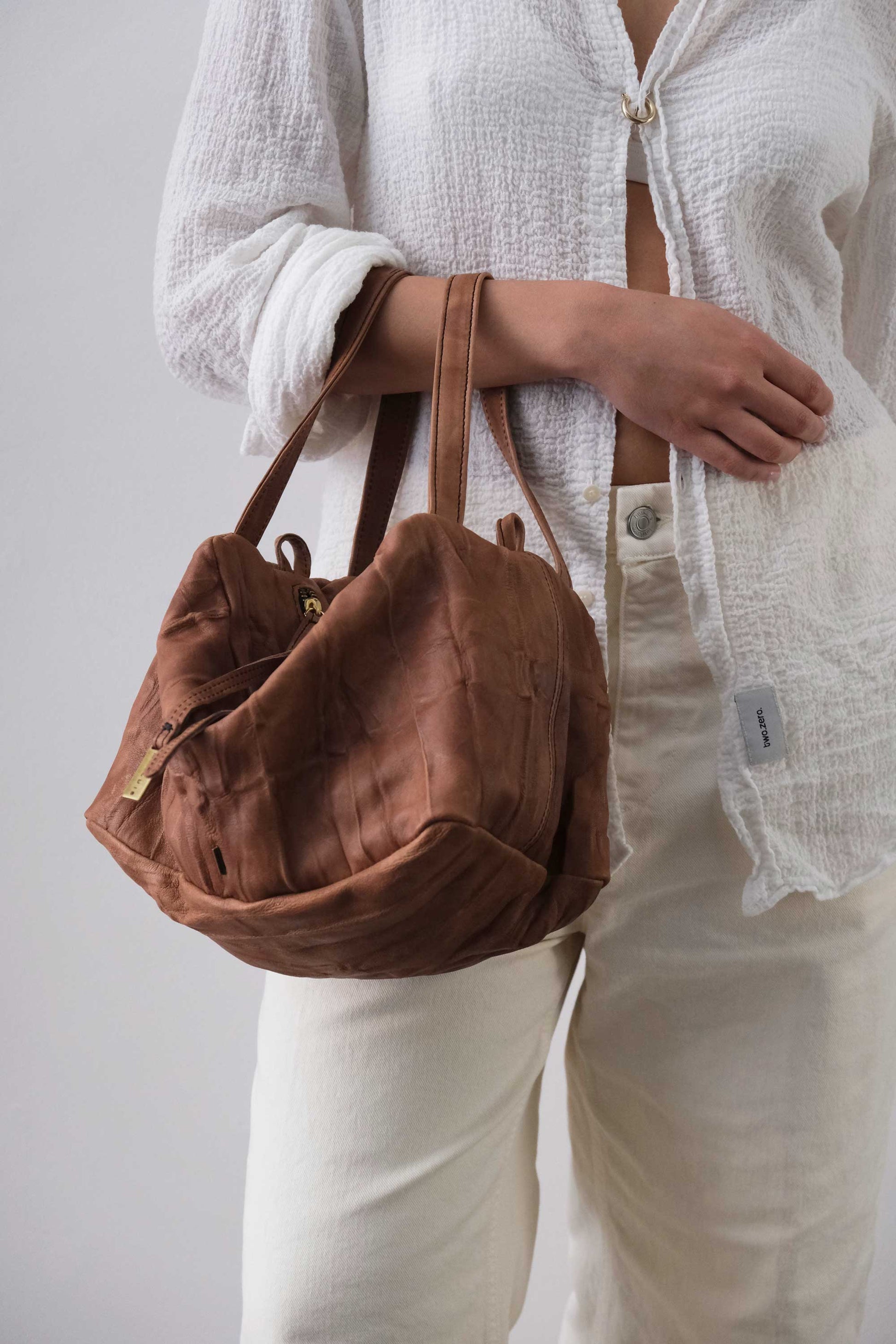 In questa versione, è realizzata in pelle conciata al vegetale, lavata e lasciata asciugare naturalmente dopo essere stata arrotolata, creando un effetto tridimensionale che esalta la texture della pelle.
