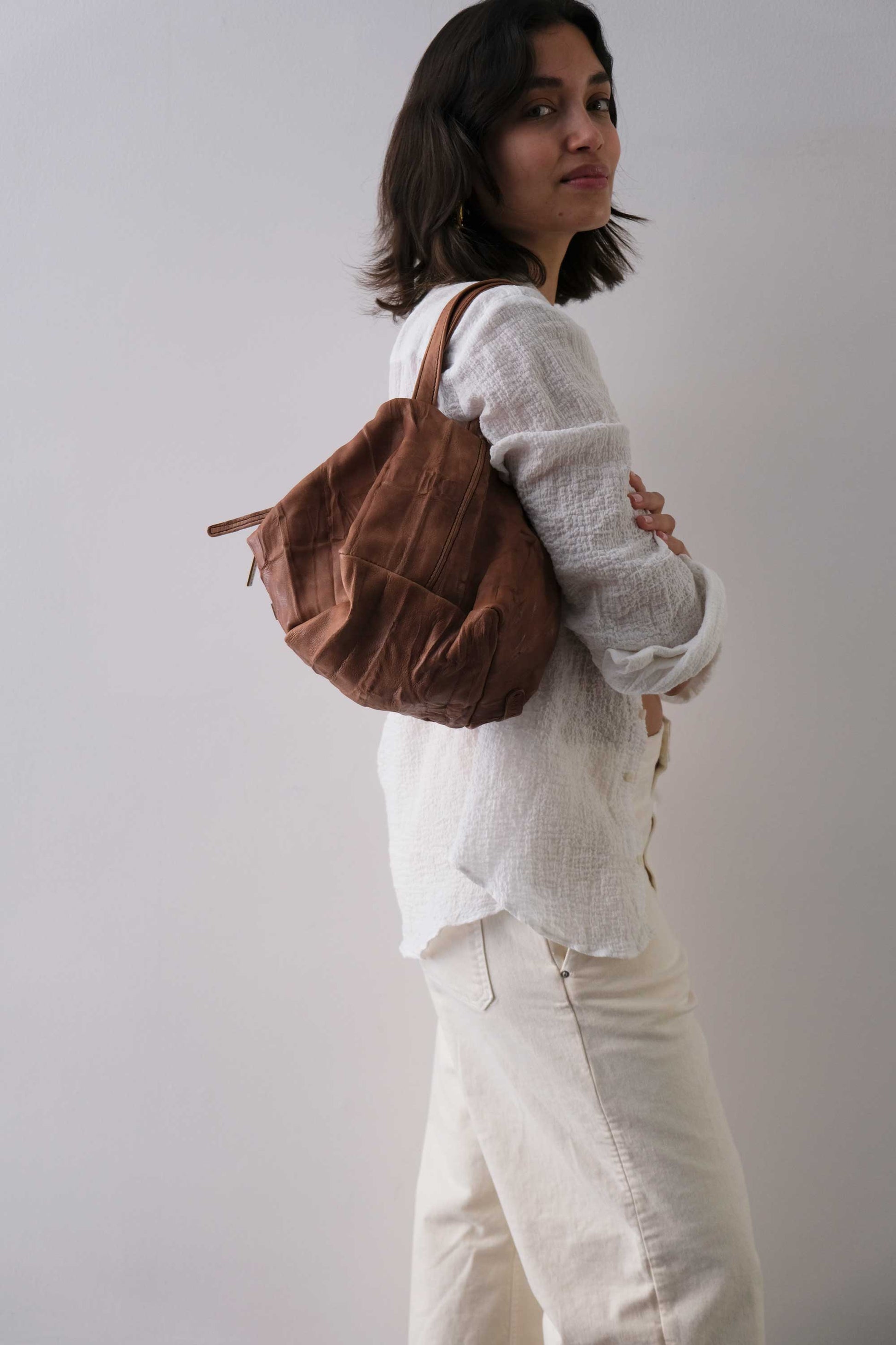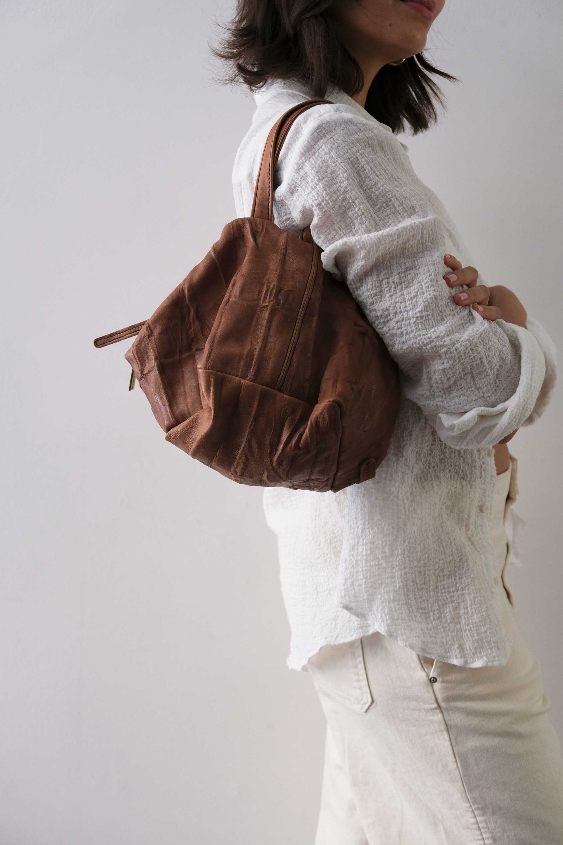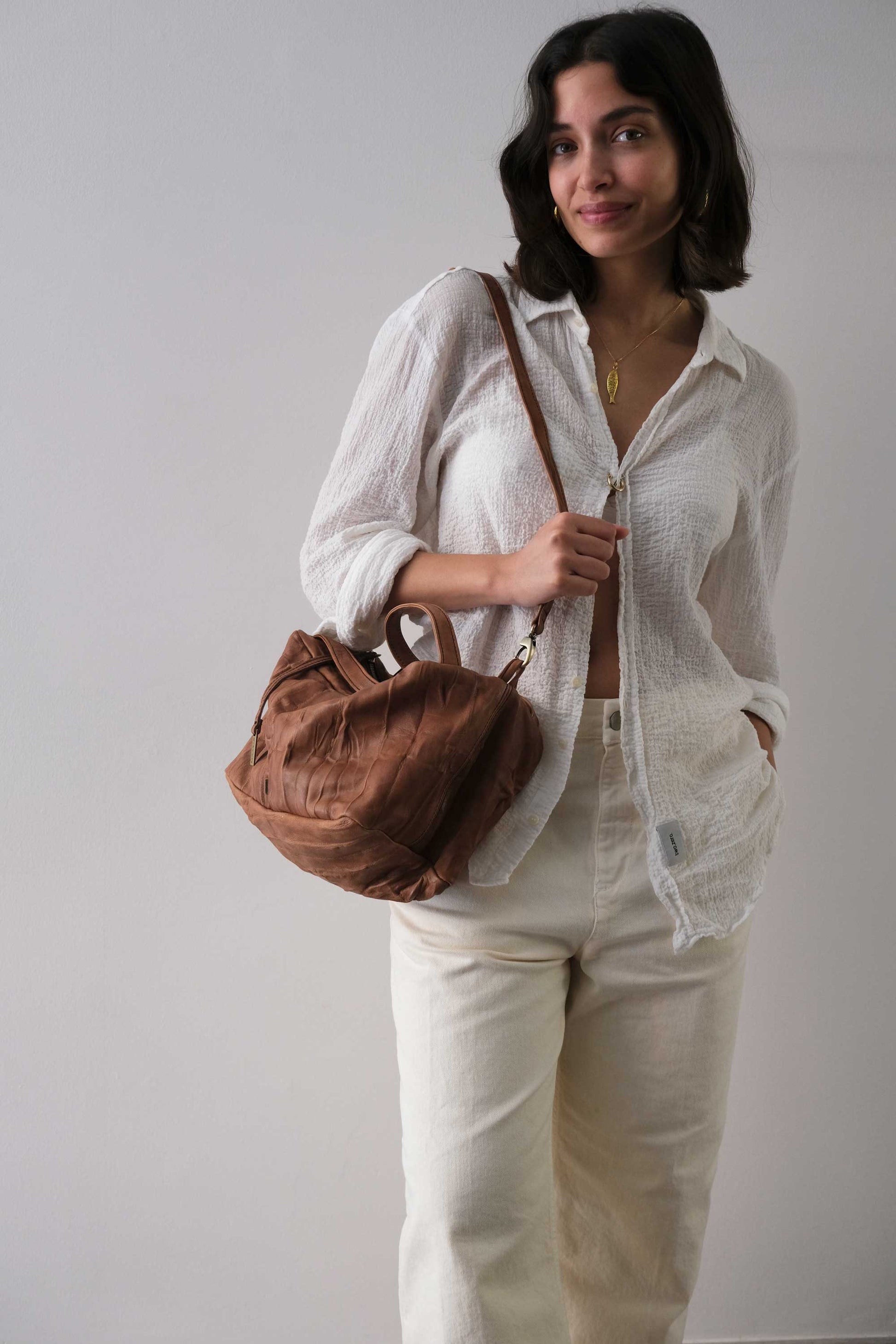 In questa versione, è realizzata in pelle conciata al vegetale, lavata e lasciata asciugare naturalmente dopo essere stata arrotolata, creando un effetto tridimensionale che esalta la texture della pelle.
