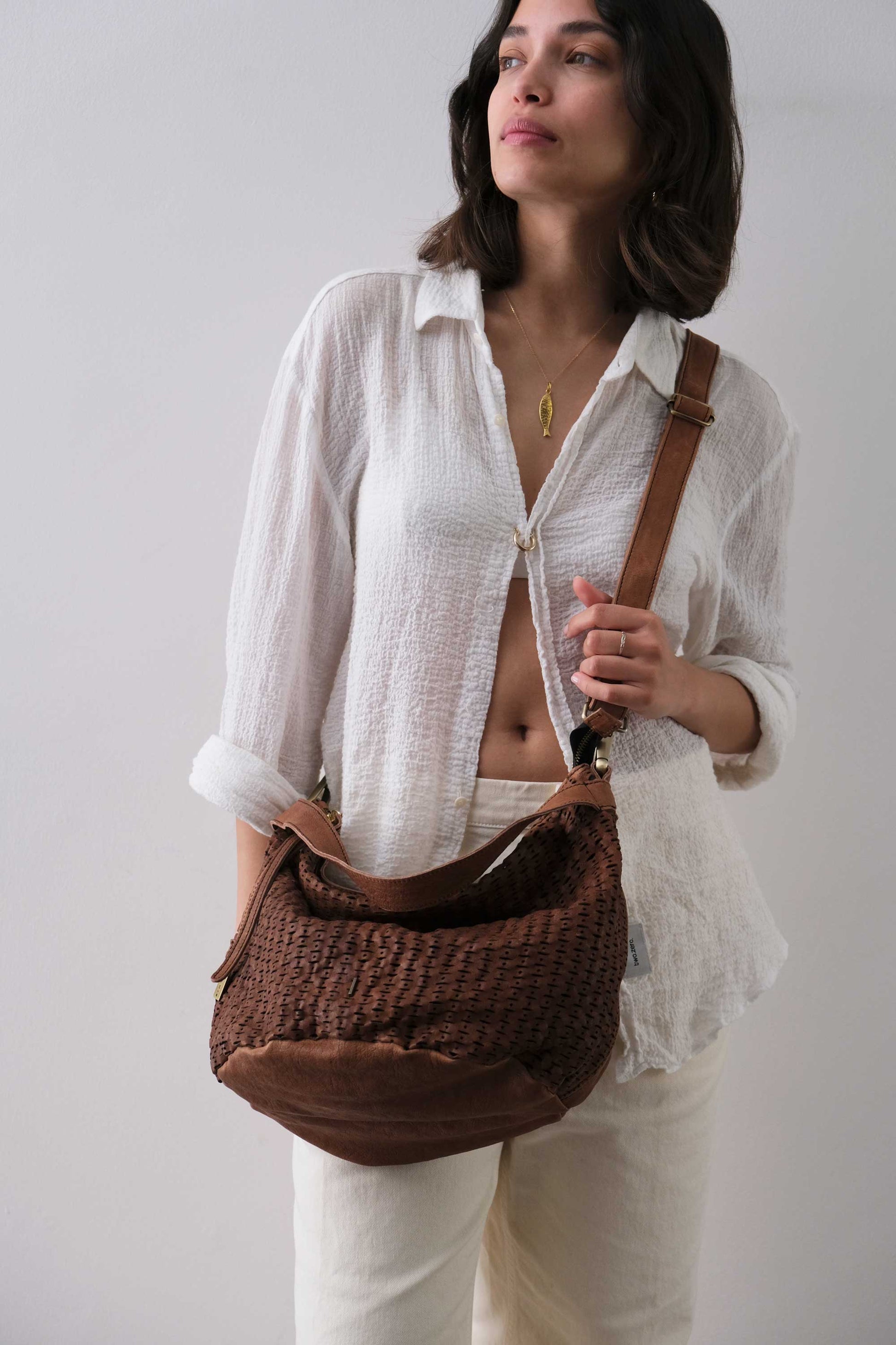 Carola bag cioccolato in morbida nappa traforata giunco - Made in Italy -