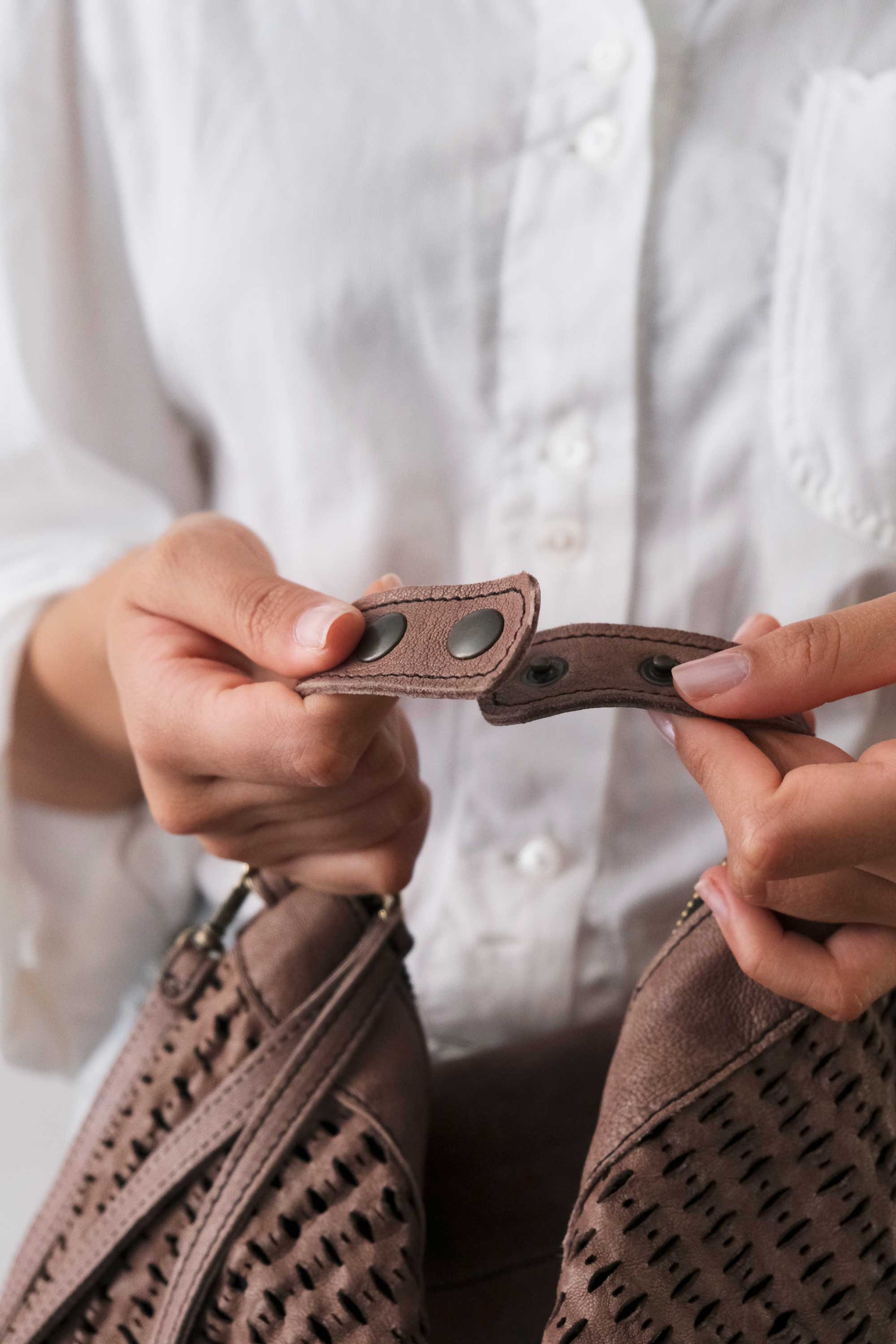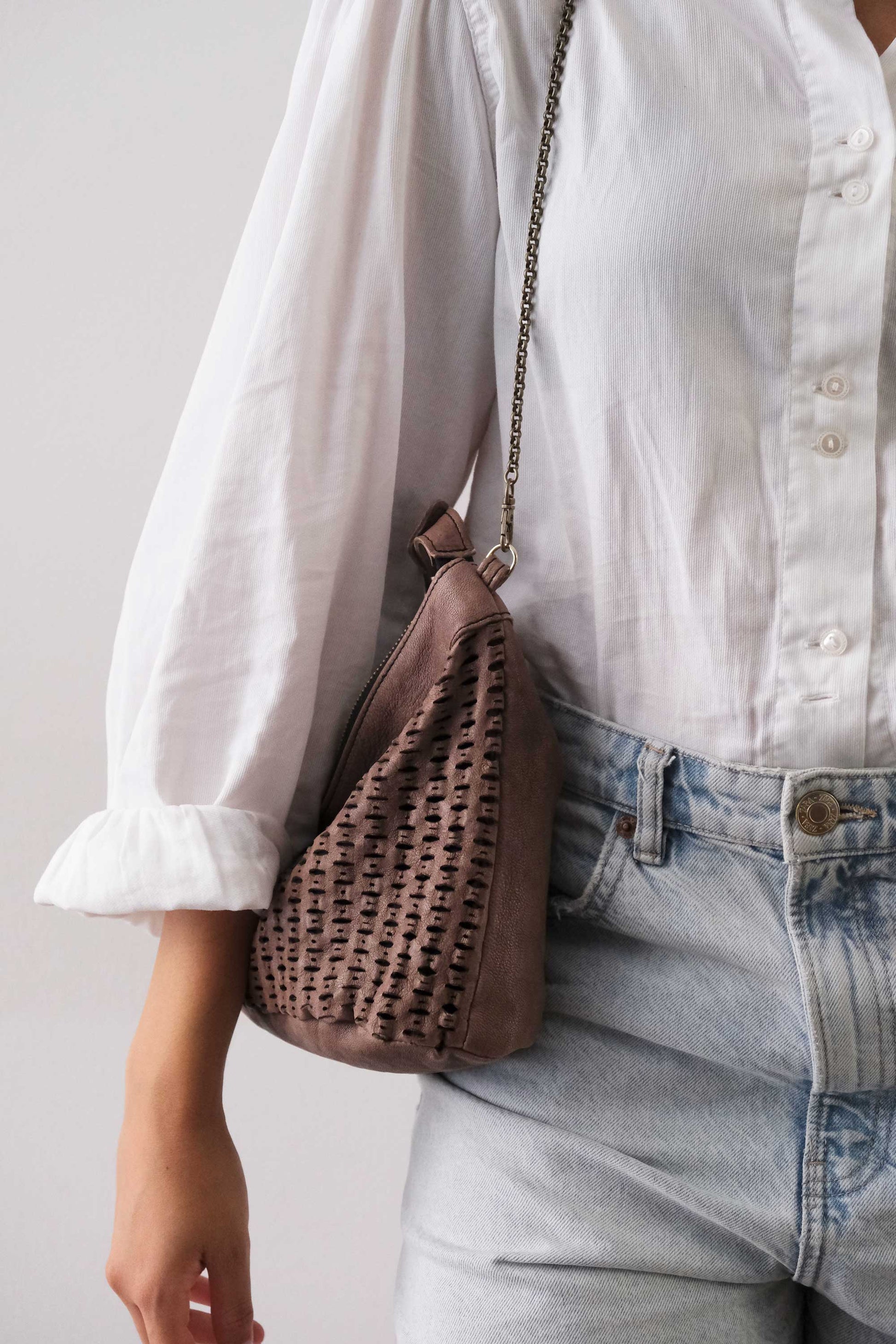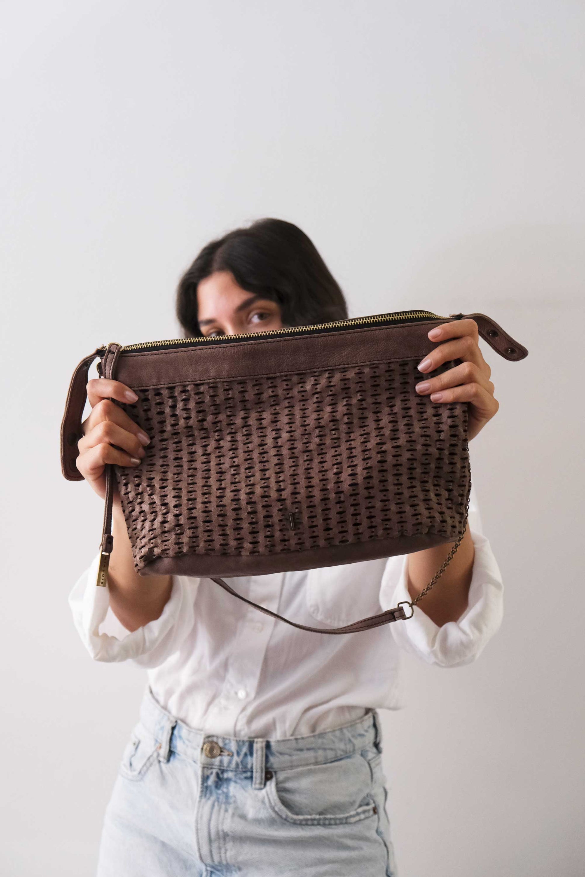 È realizzata in pelle conciata al vegetale, lavata e asciugata all’aria per ottenere un aspetto naturale e una sensazione calda e morbida al tatto. In questa versione, la pelle è stata traforata al laser per creare un effetto ancora più tridimensionale chiamato “giunco”.