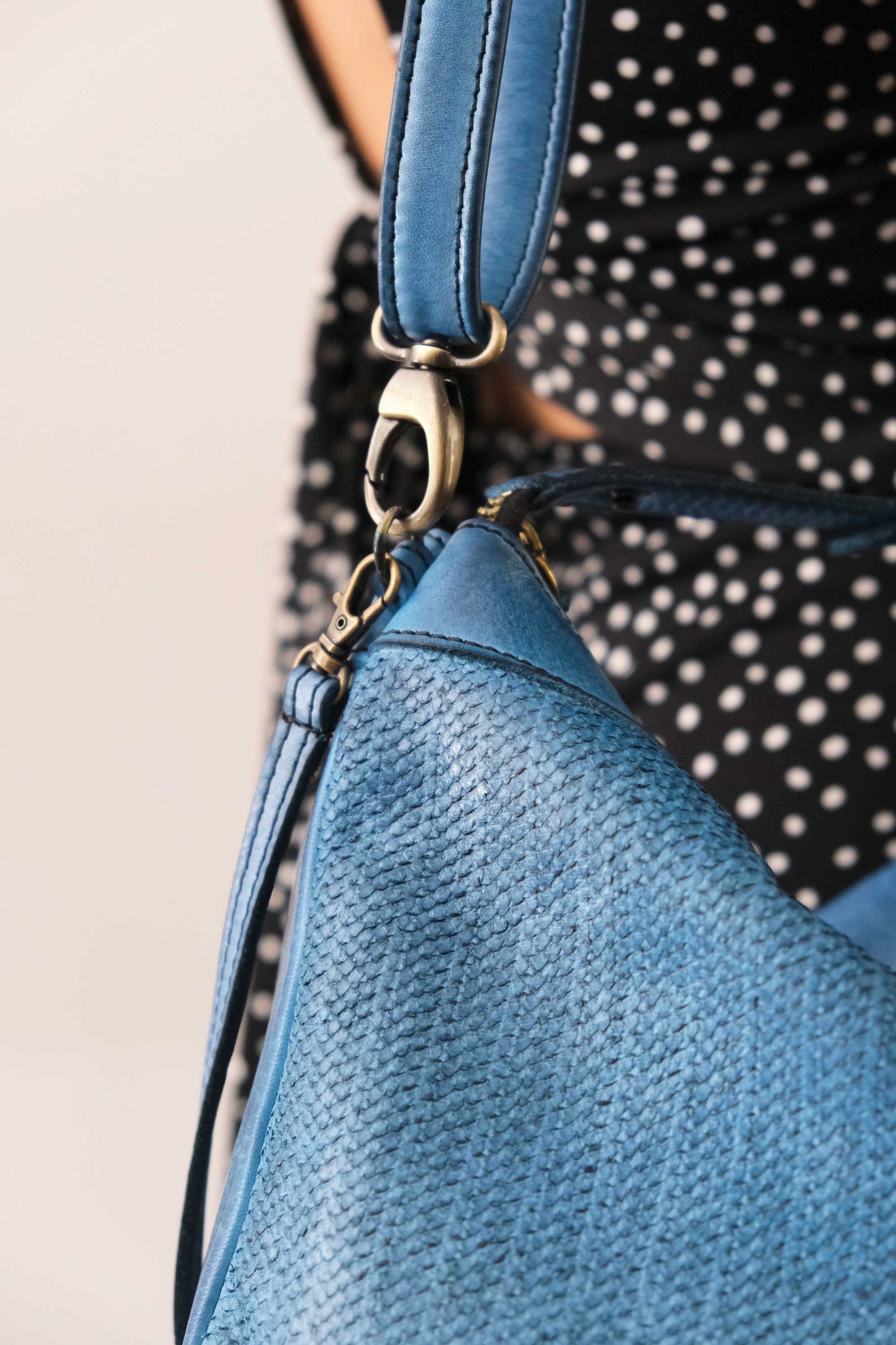 La pelle non subisce trattamenti chimici e nocivi, mantiene le sue caratteristiche naturali che includono anche variazioni di sfumature di colore nelle venature. Queste variazioni non costituiscono un difetto della pelle, ma rendono ogni borsa unica proprio come chi la indossa.