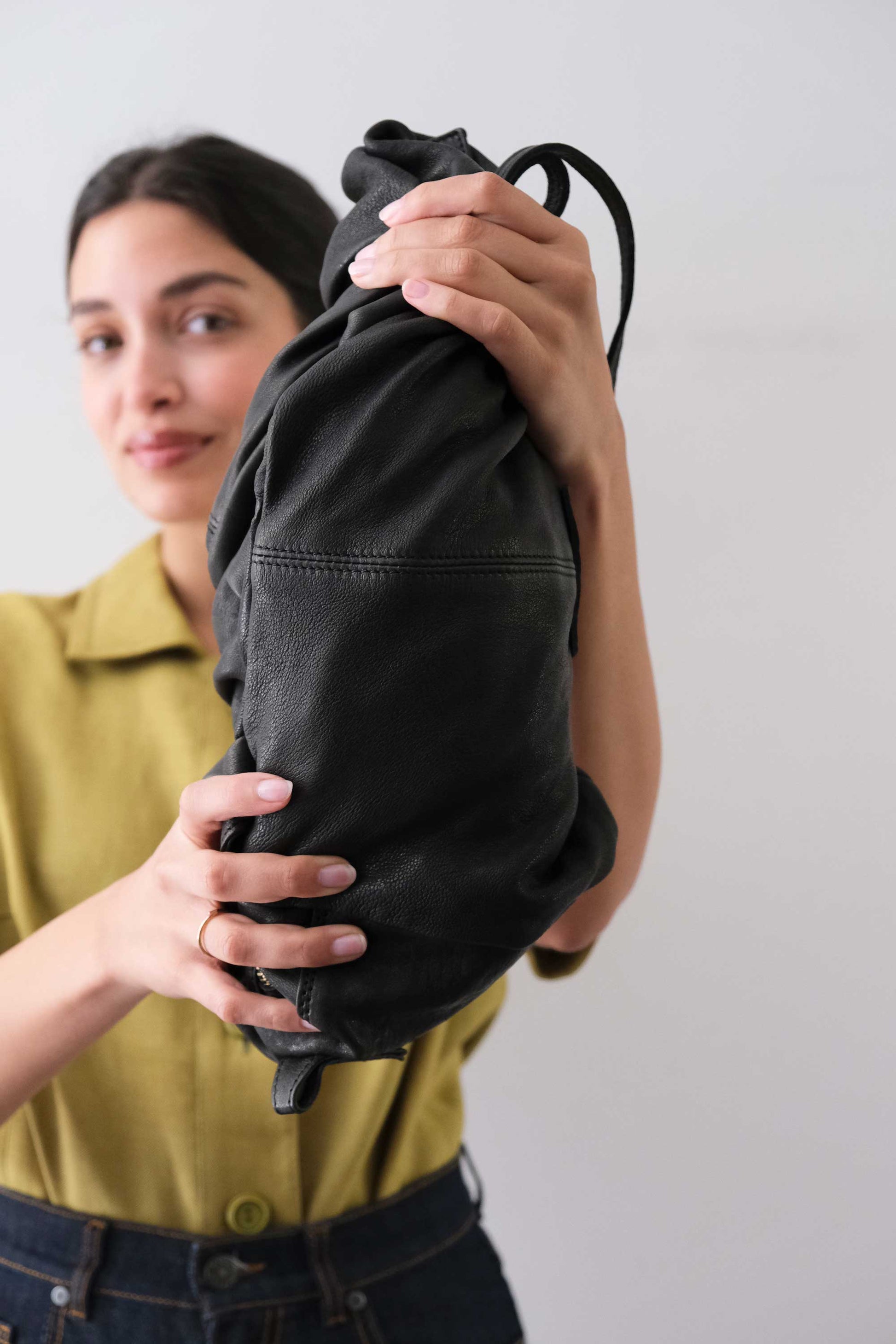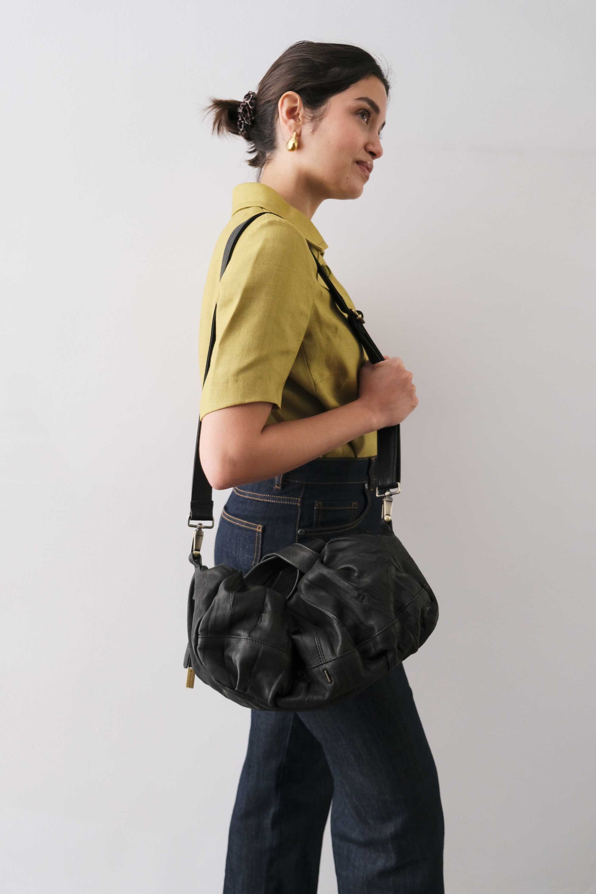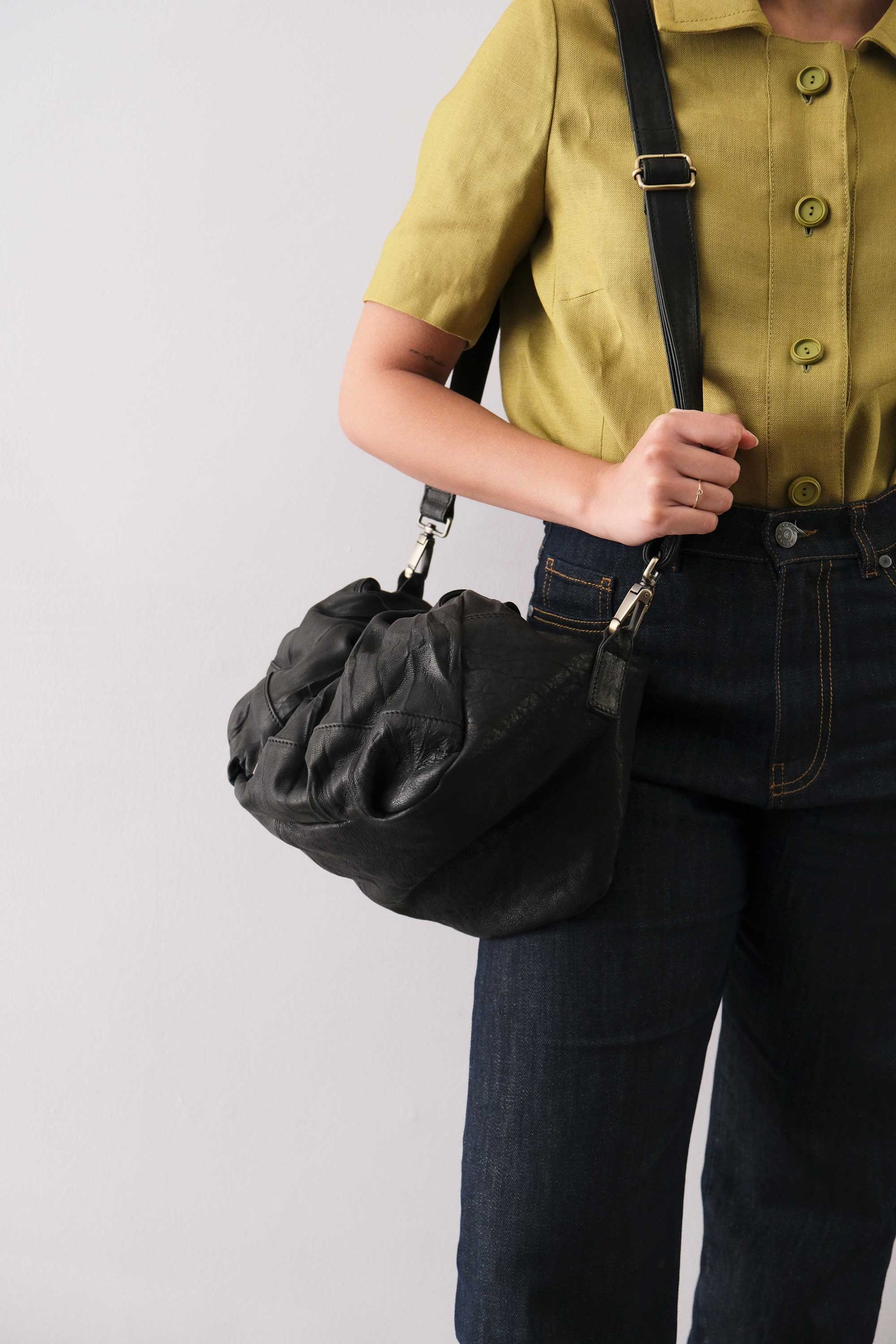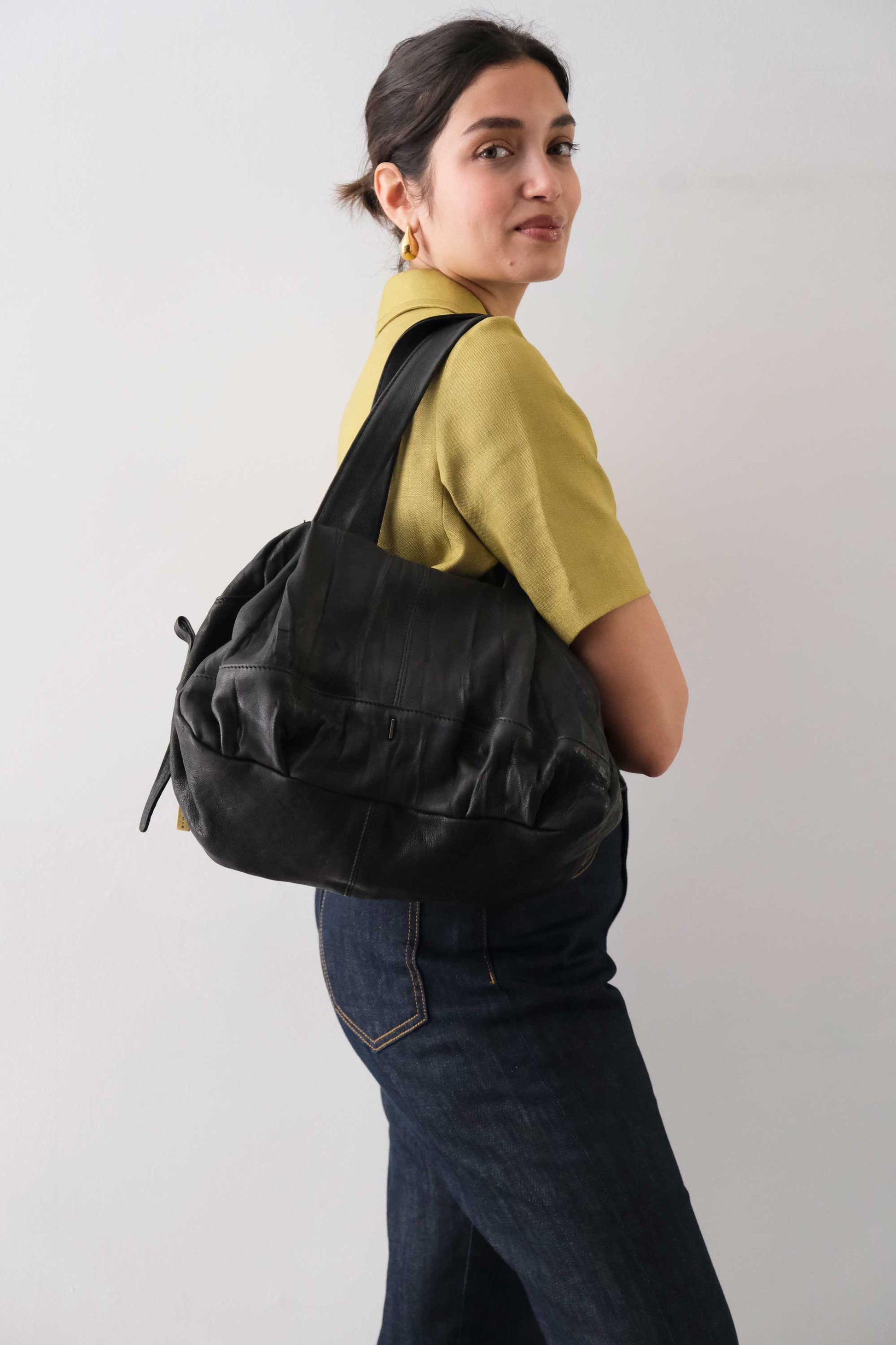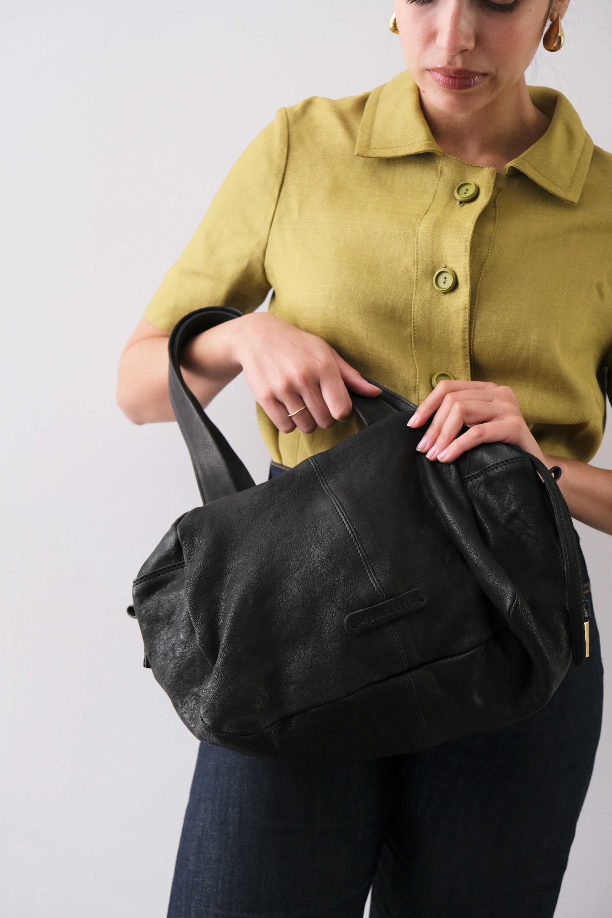 Betty is an interpretation of the Barrel bag. Extremely lightweight, as like all the brand's bags, it is made with very thin leather. It can be worn on the shoulder or crossbody. Very spacious due to the size of the base, but thanks to its softness, if not fully packed, the base contracts, allowing for comfortable portability.