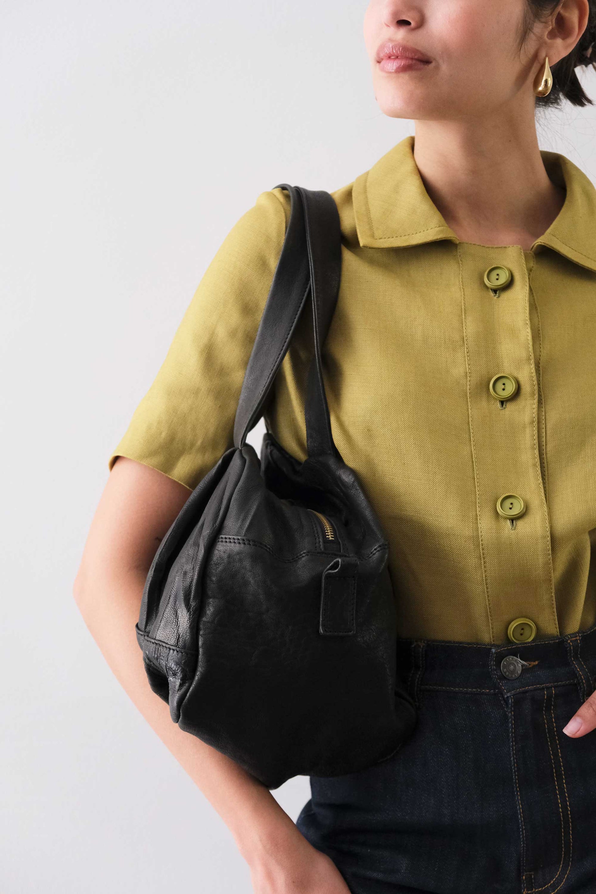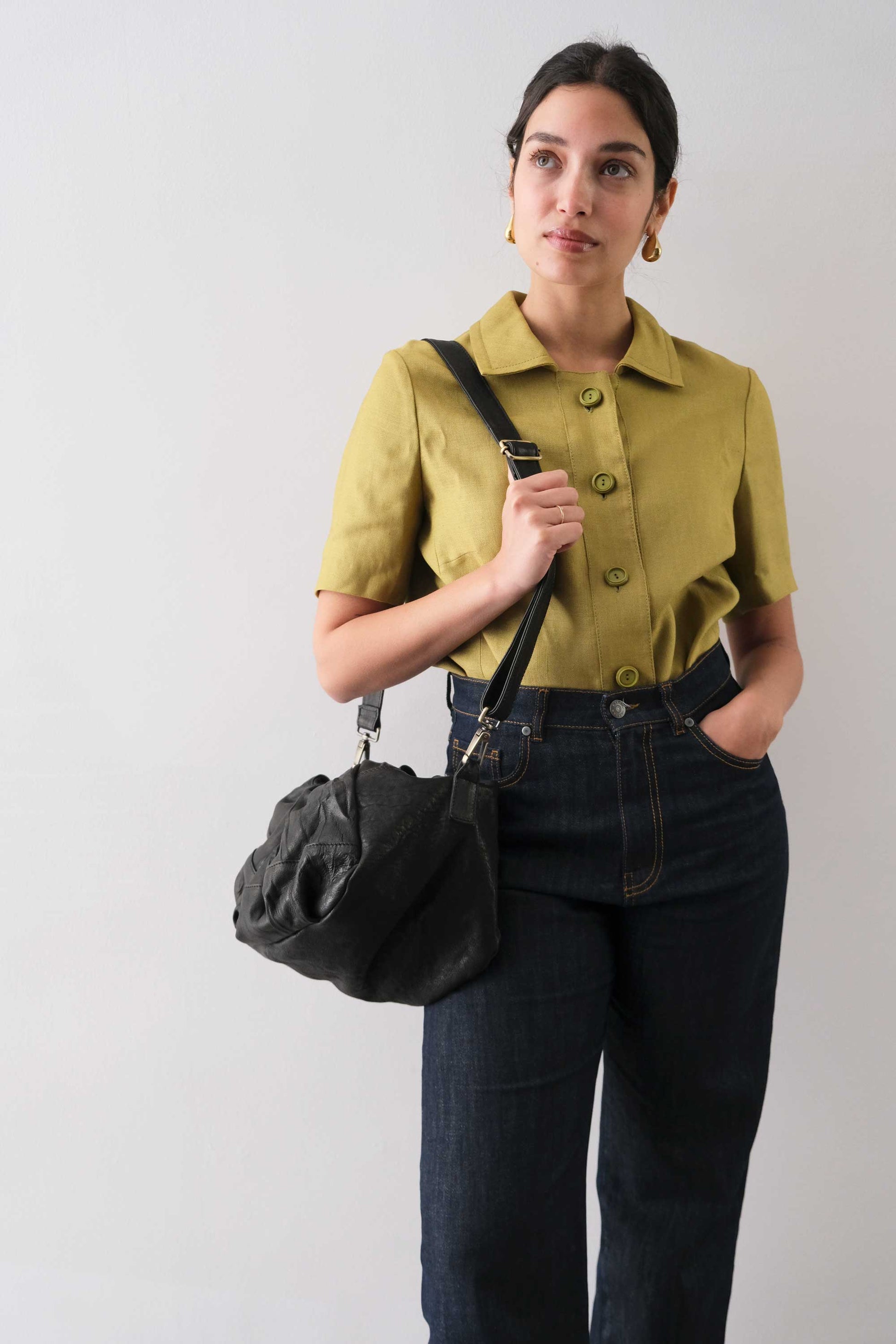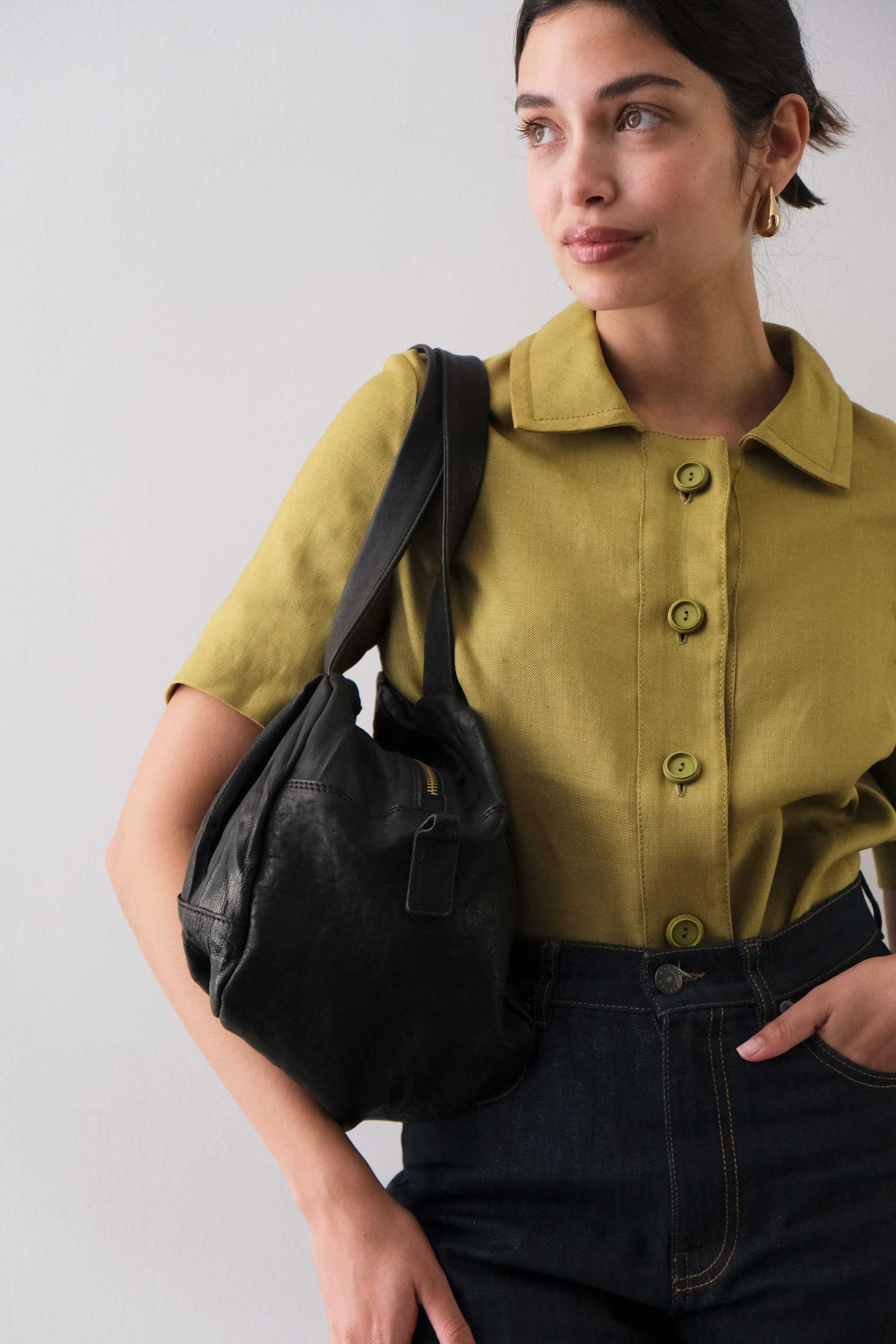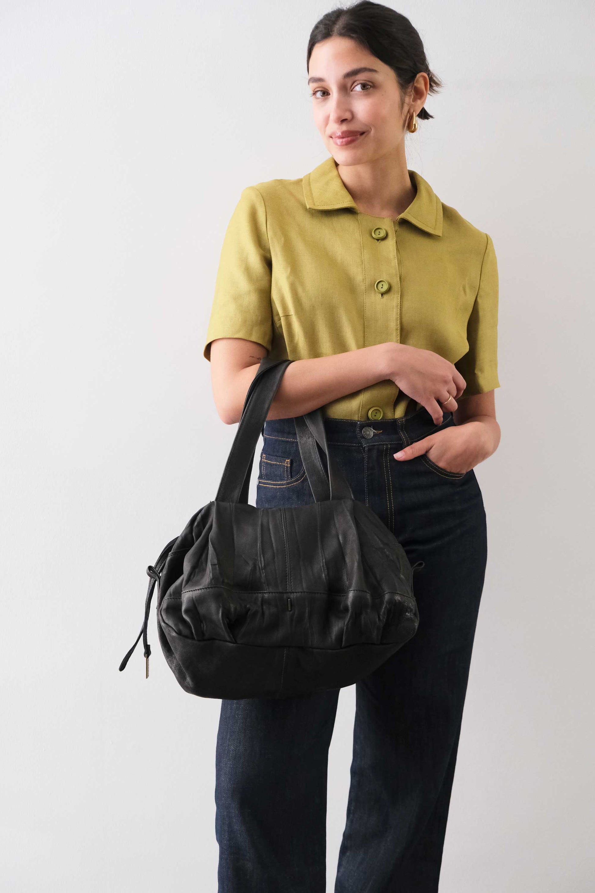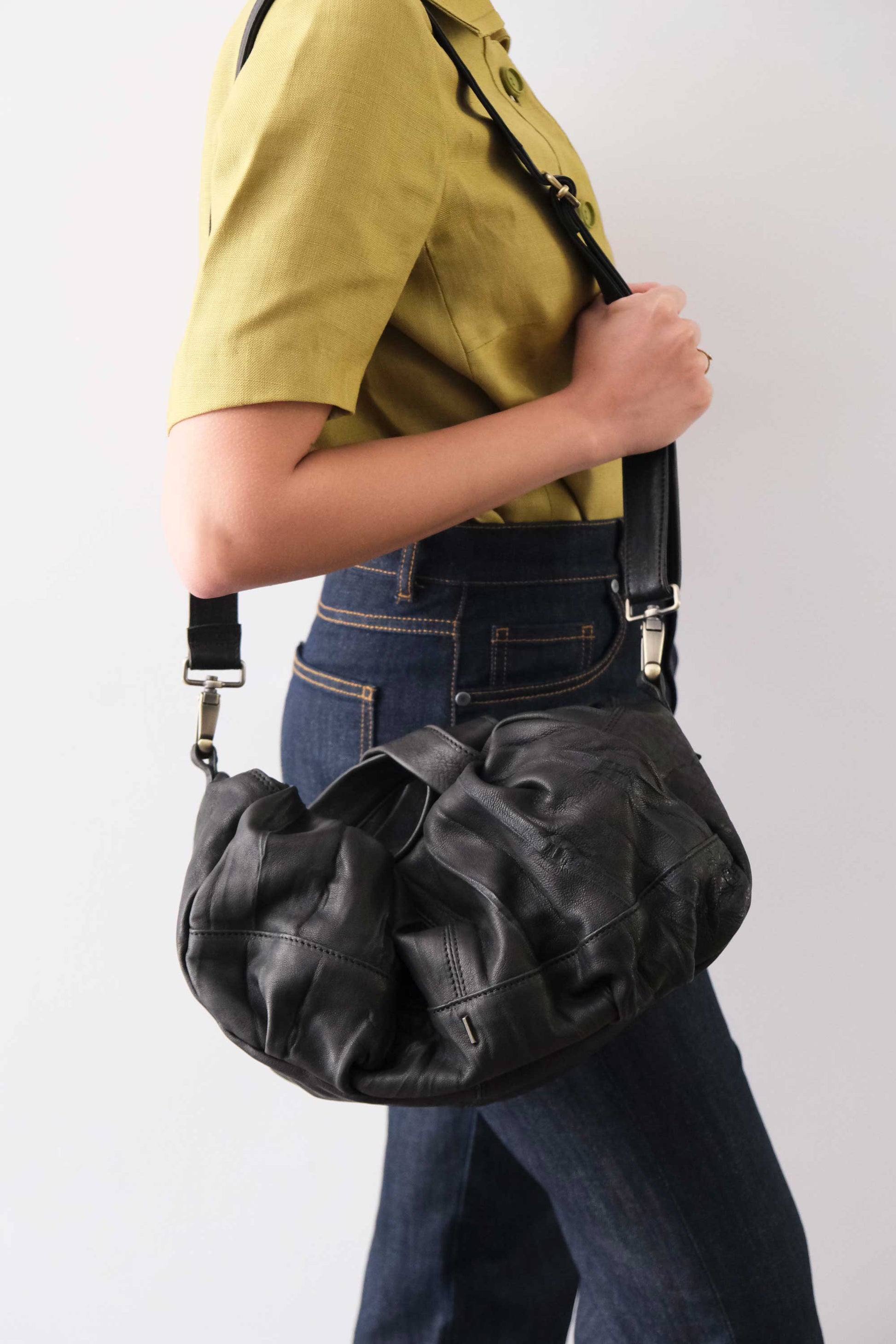 Betty is an interpretation of the Barrel bag. Extremely lightweight, as like all the brand's bags, it is made with very thin leather. It can be worn on the shoulder or crossbody. Very spacious due to the size of the base, but thanks to its softness, if not fully packed, the base contracts, allowing for comfortable portability.