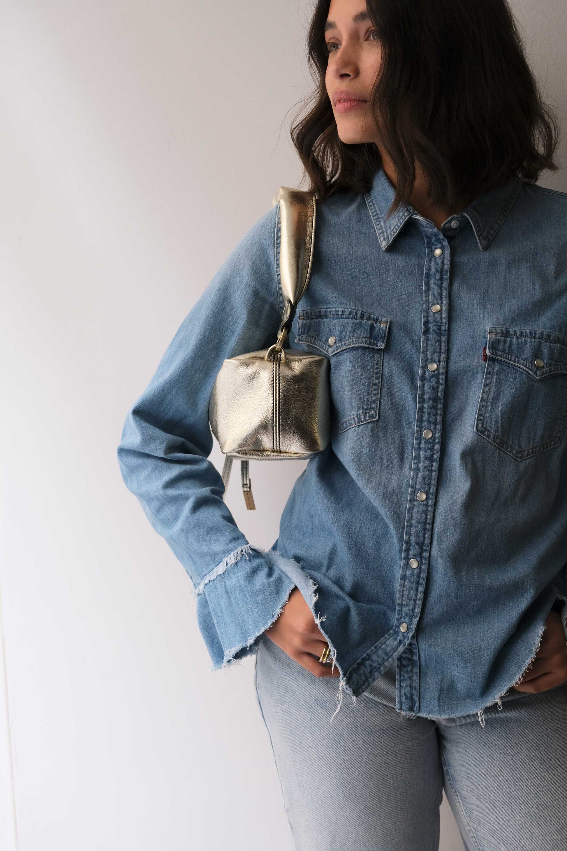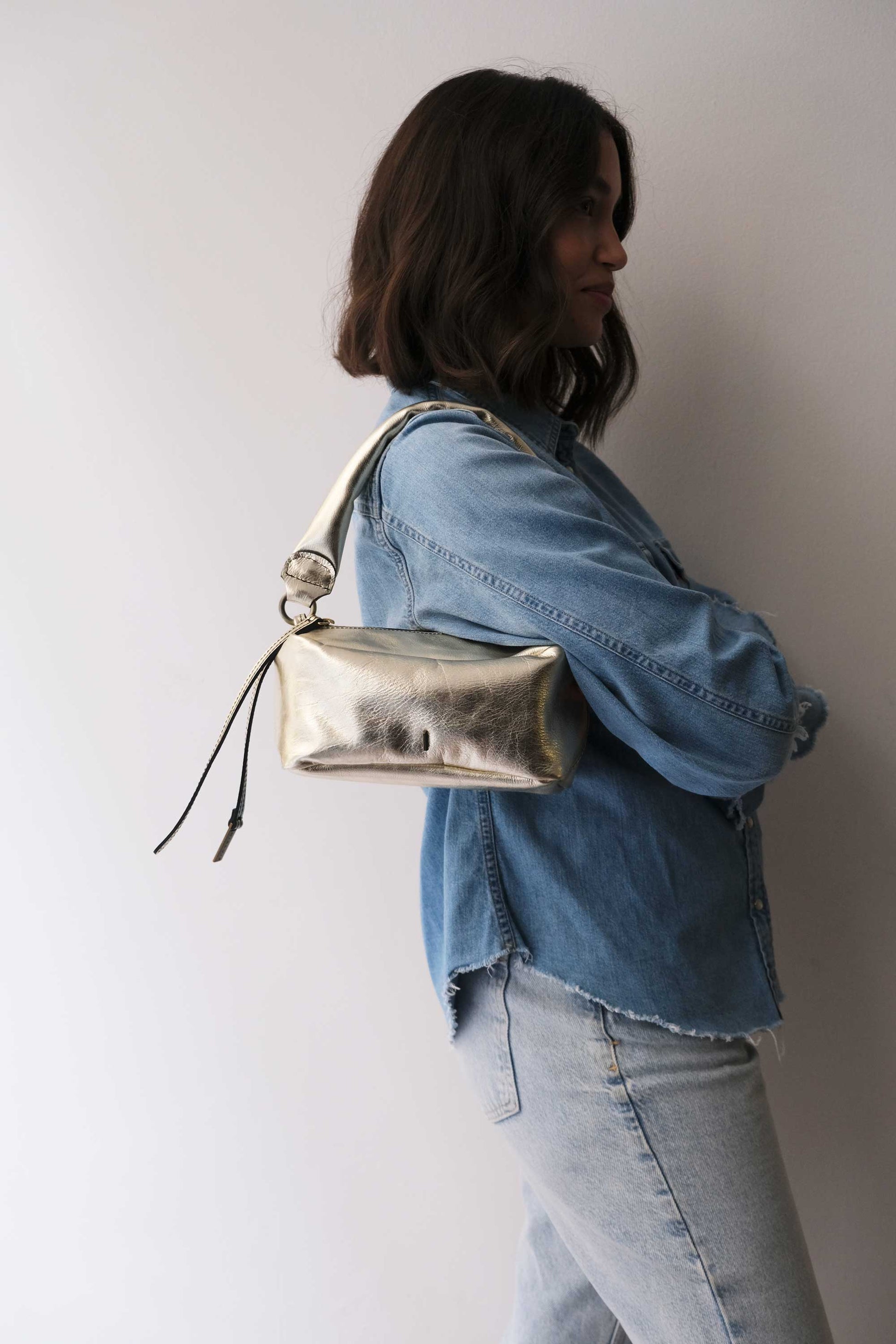 In this version, it is crafted from mineral-tanned calf leather with a gold foil finish. Its lightness is preserved, but compared to the other versions, the material is more structured. The handle is padded and soft, almost like a little stress-reliever when you touch it. Thanks to the two clasps, the handle can be easily removed.