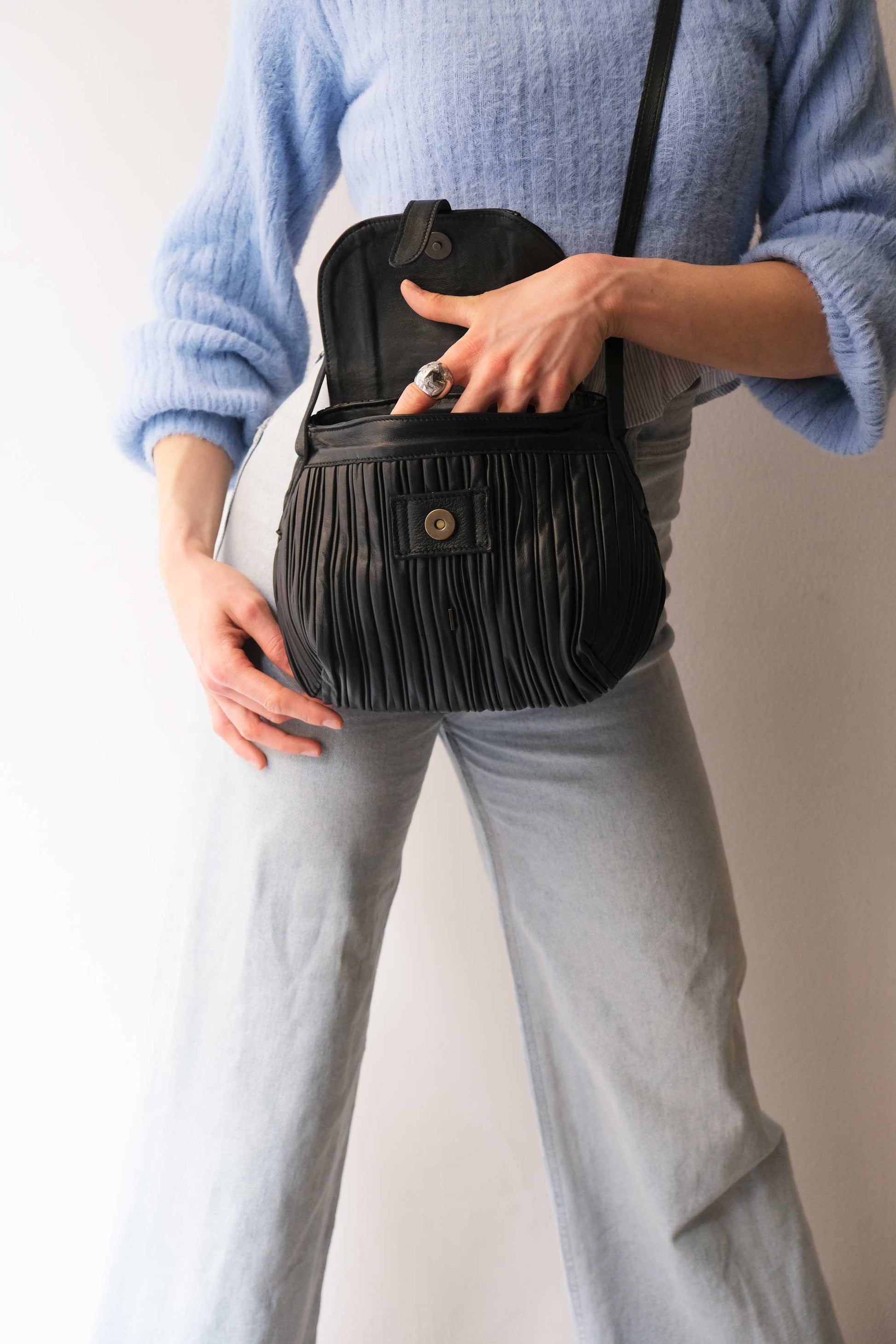 Despite its compact size, the interior is designed to hold everything you need during the day: your phone, a small pouch, and your everyday essentials.