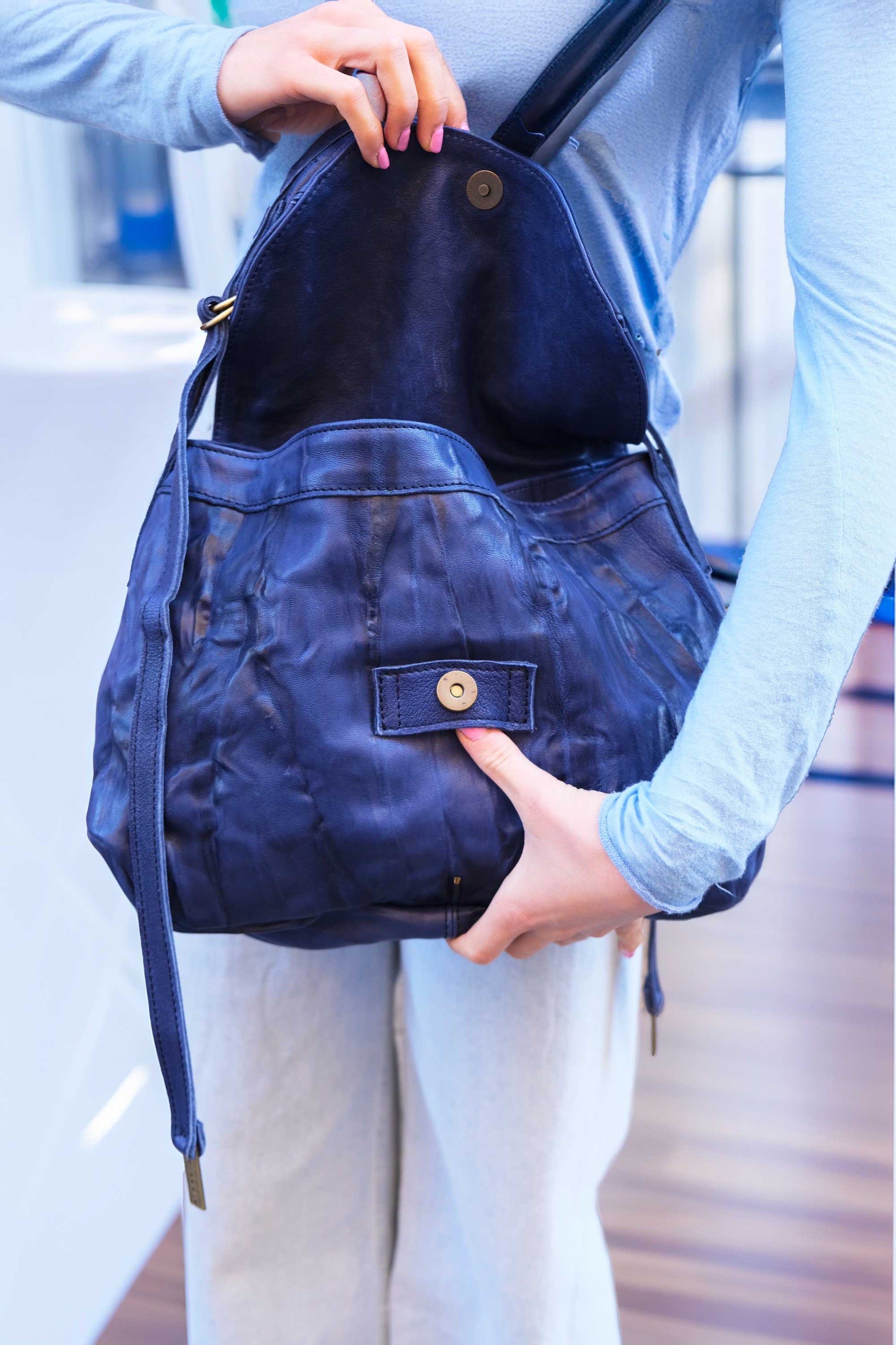The leather doesn’t submit chemical and harmful treatments, it keeps its natural features which include also variations of color nuances in veining. These variations don’t constitute a leather defect instead make each bag unique just like its bearer.