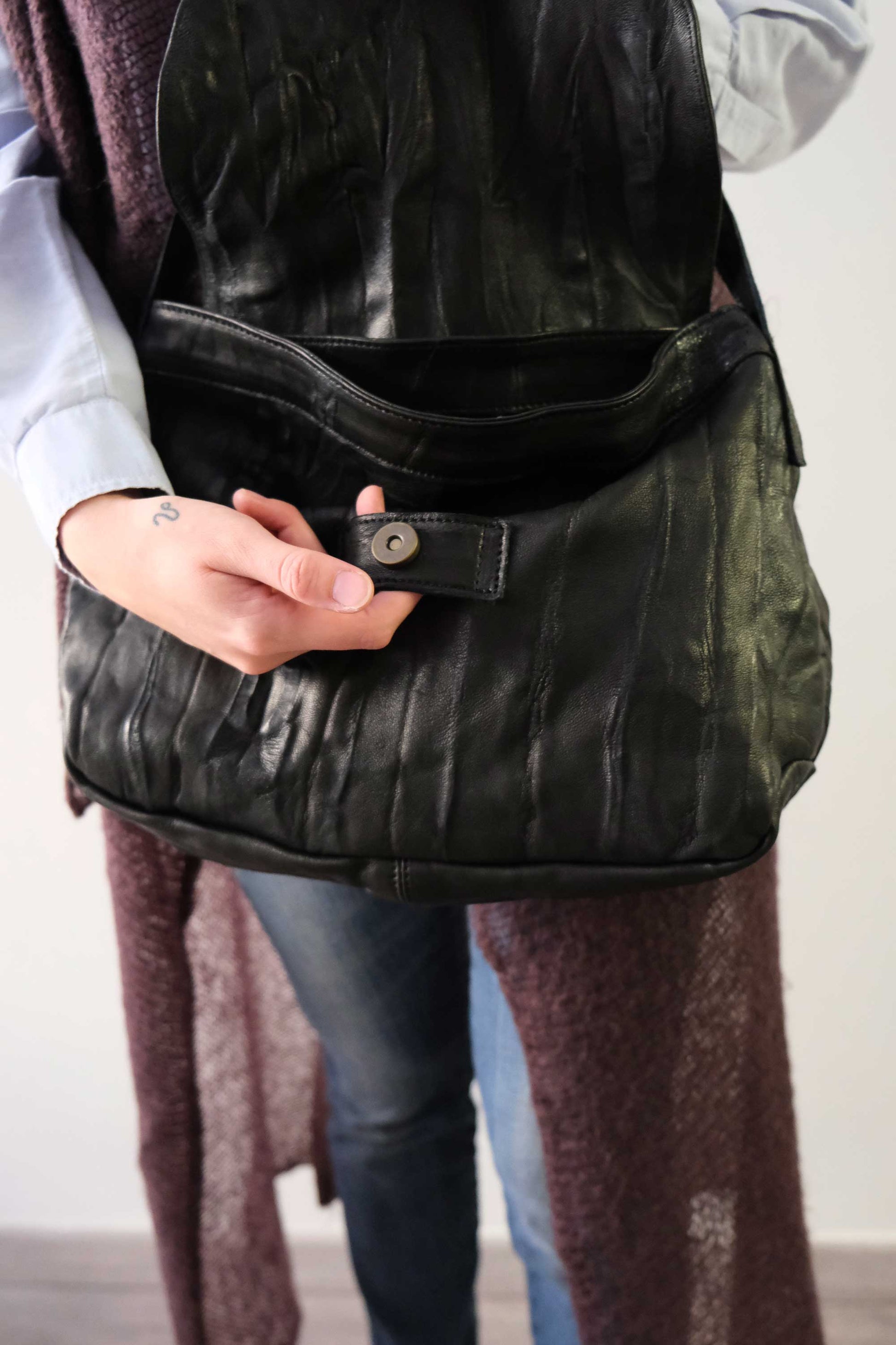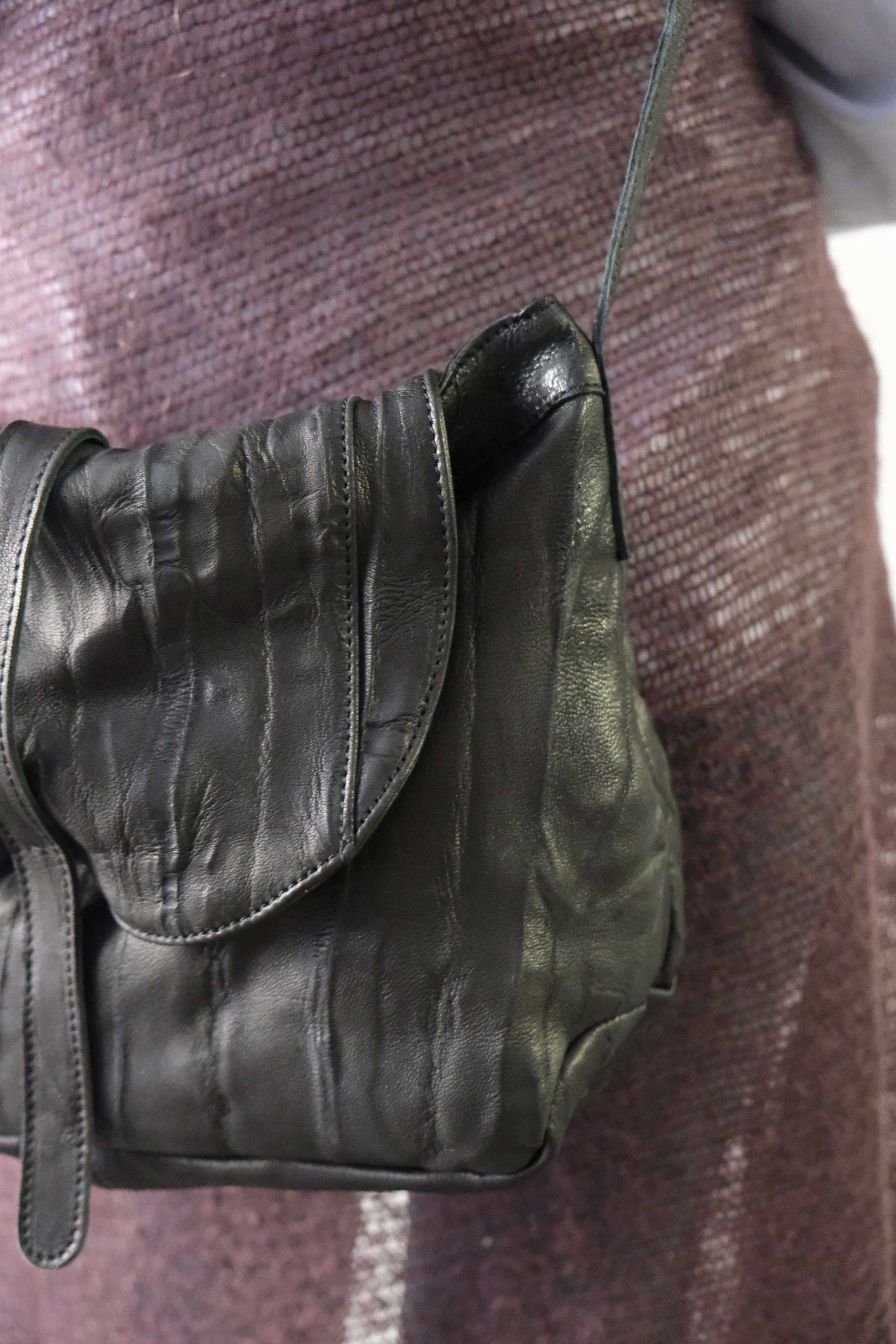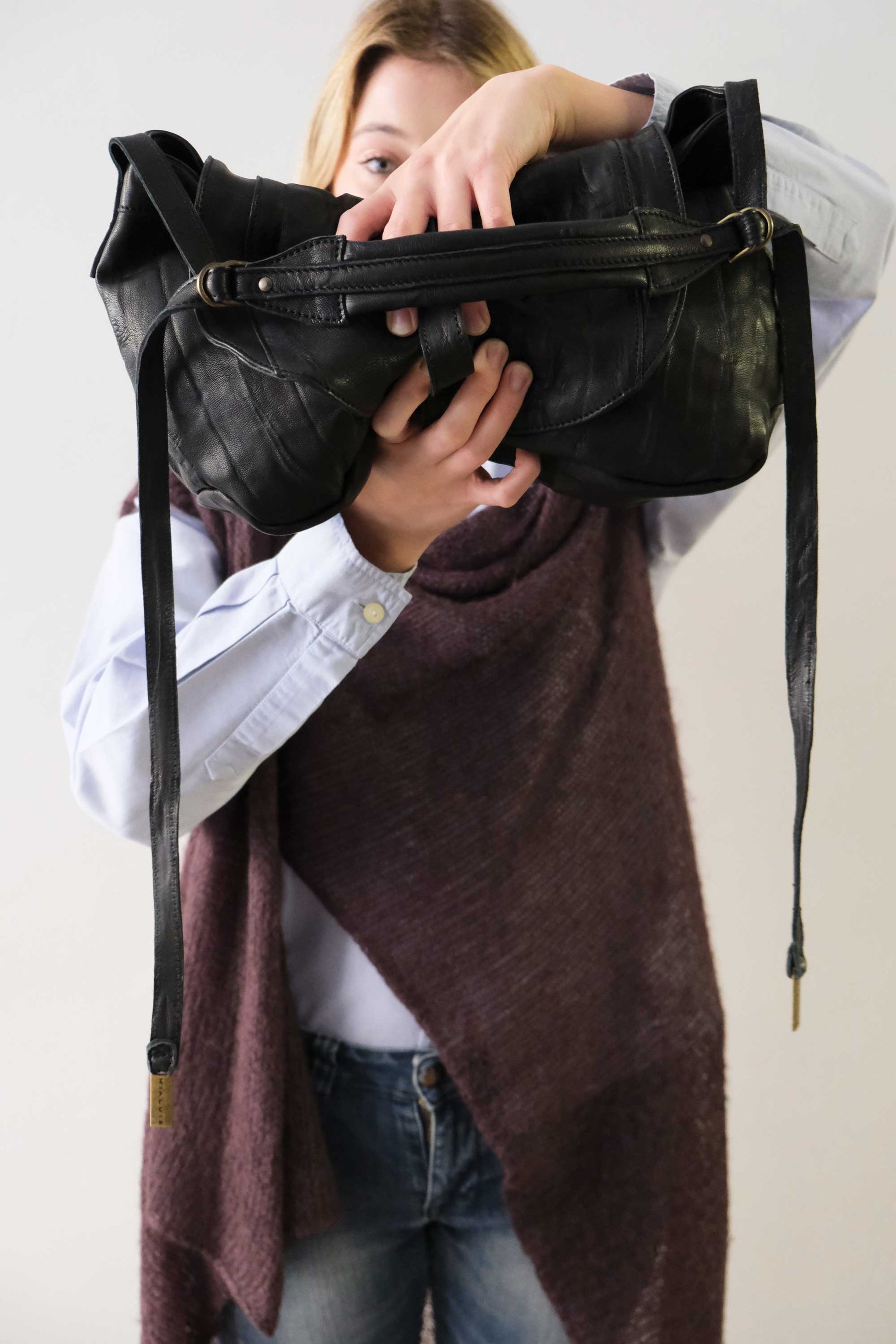 In this version, the vegetable-tanned leather is washed and left to dry naturally, tied onto itself to create a pleated effect that gives the surface a three-dimensional, textured appearance.