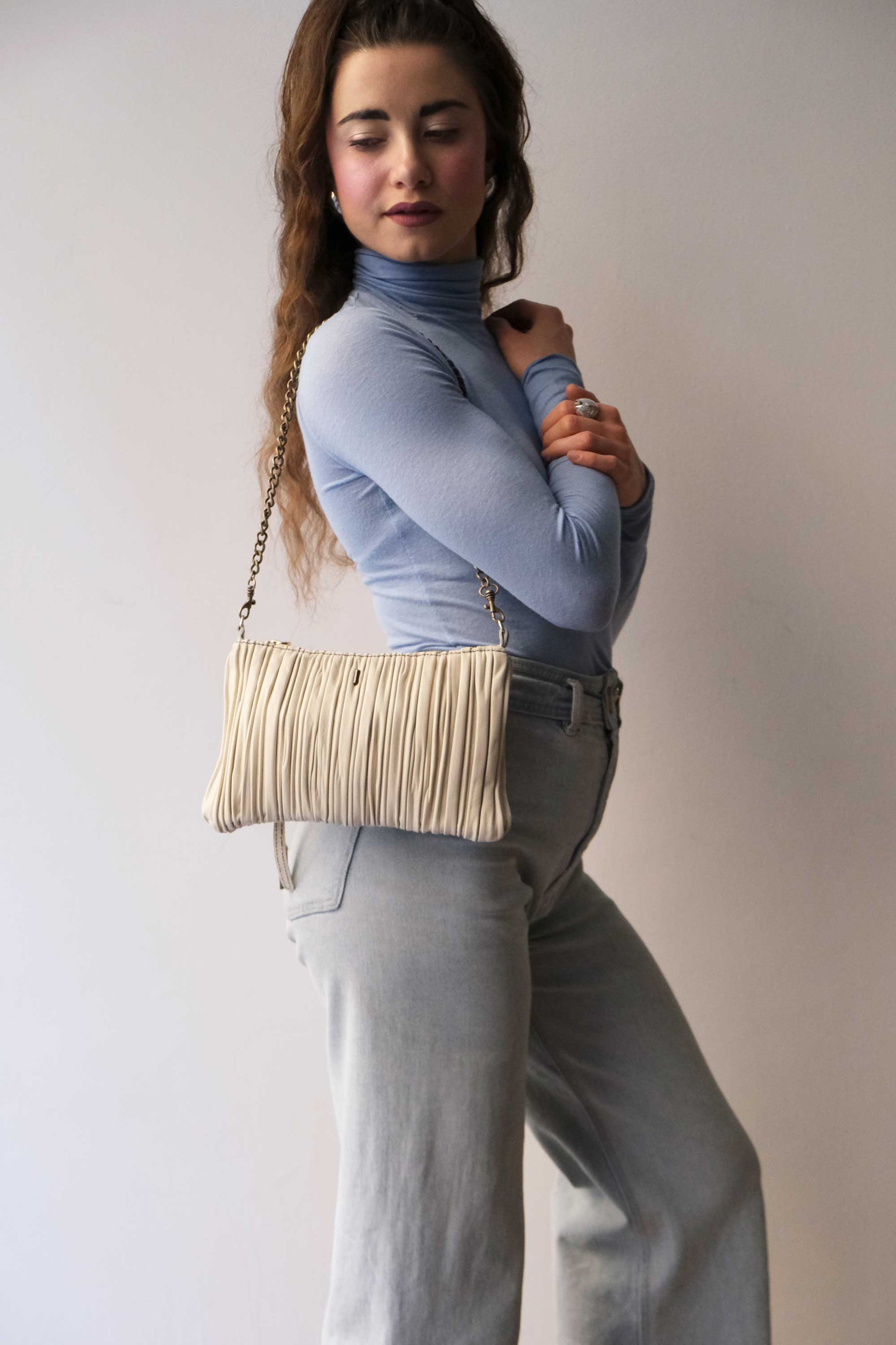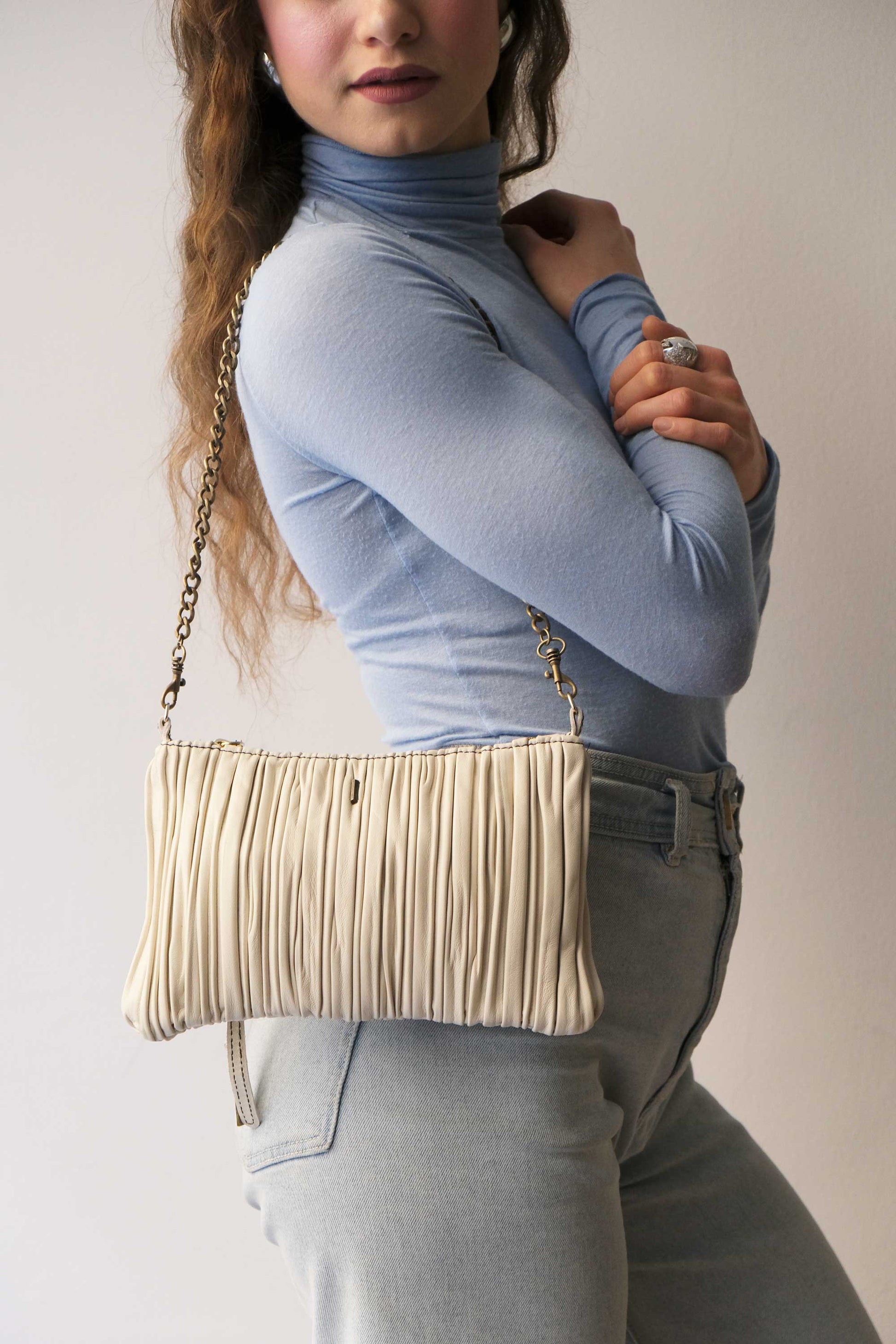Made in Italy, and craft bag, Mikin pochette is versatile choice to face with elegance and lightness the modern woman's daily routine. The pleated version has no pocket on the front bag. Made from mineral-tanned leather, it is intentionally pleated in an irregular pattern to give the leather a three-dimensional effect.