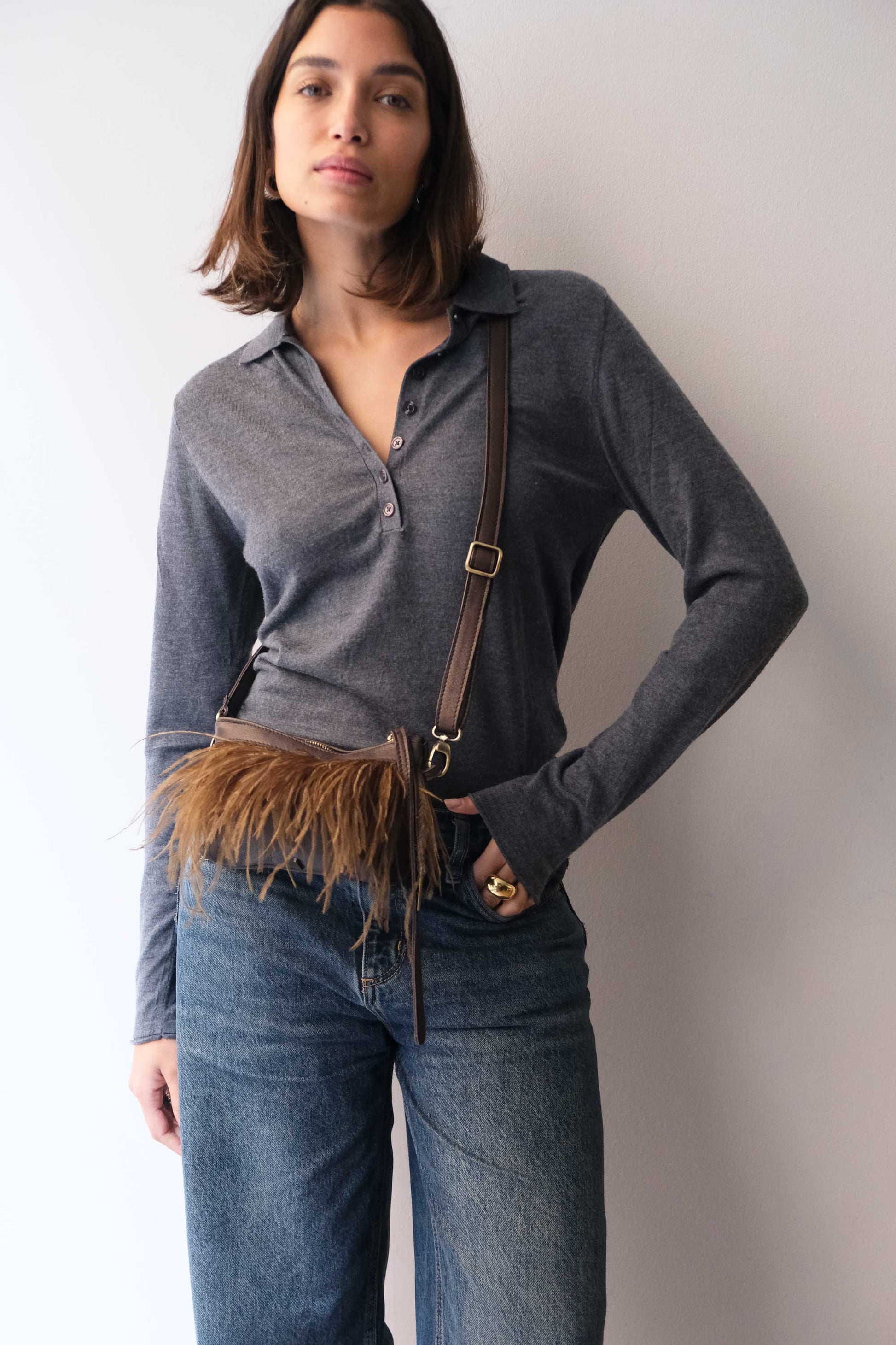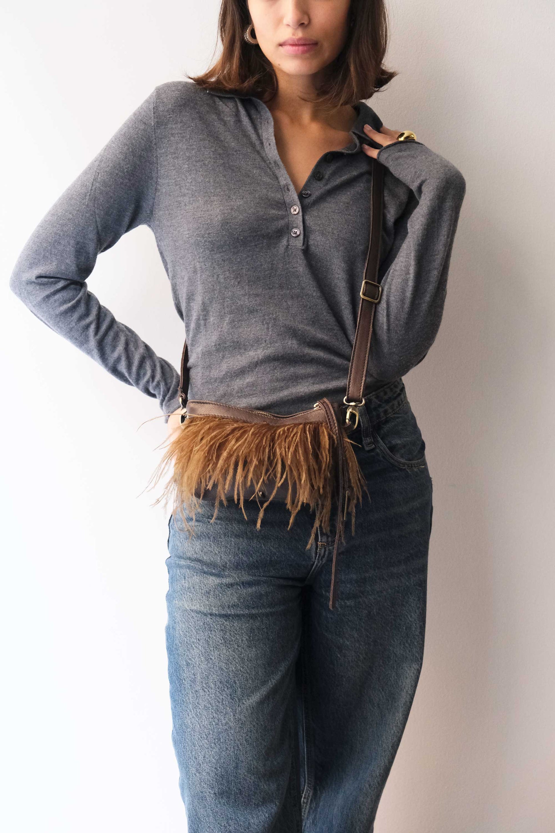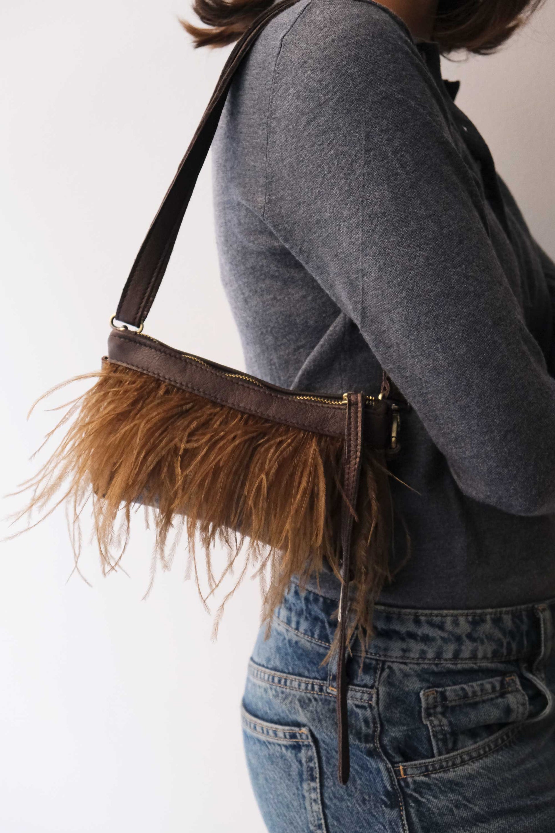 Made of vegetable-tanned leather, it is adorned with ostrich feathers sourced from one of the last Italian companies specializing in their production. This historic company has supplied feathers to RAI for years, helping to create the magic of vintage shows and dressing ballerinas with elegance and refinement. With the Olga pochette, we aim to bring a touch of that same magic to you.