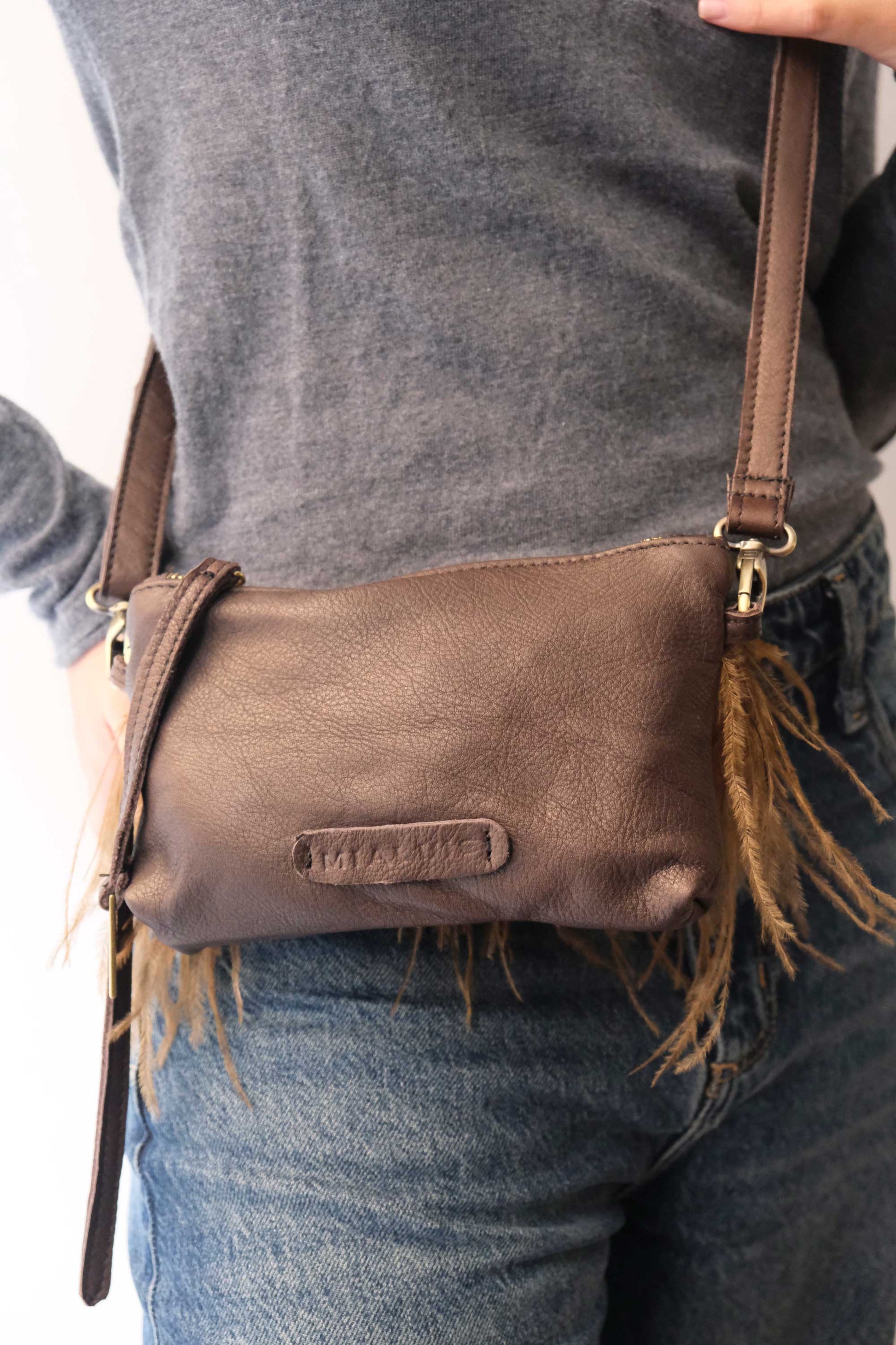 Olga pochette in brown nappa leather with moss feathers - Made in Italy -
