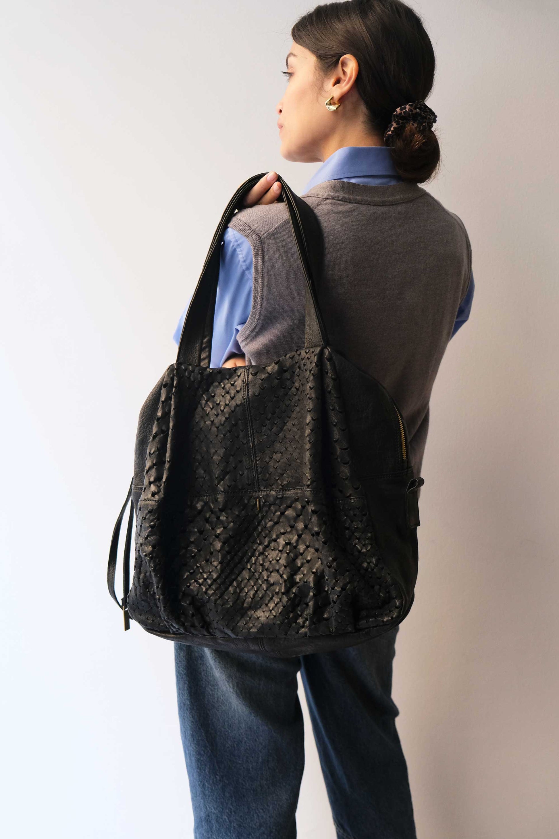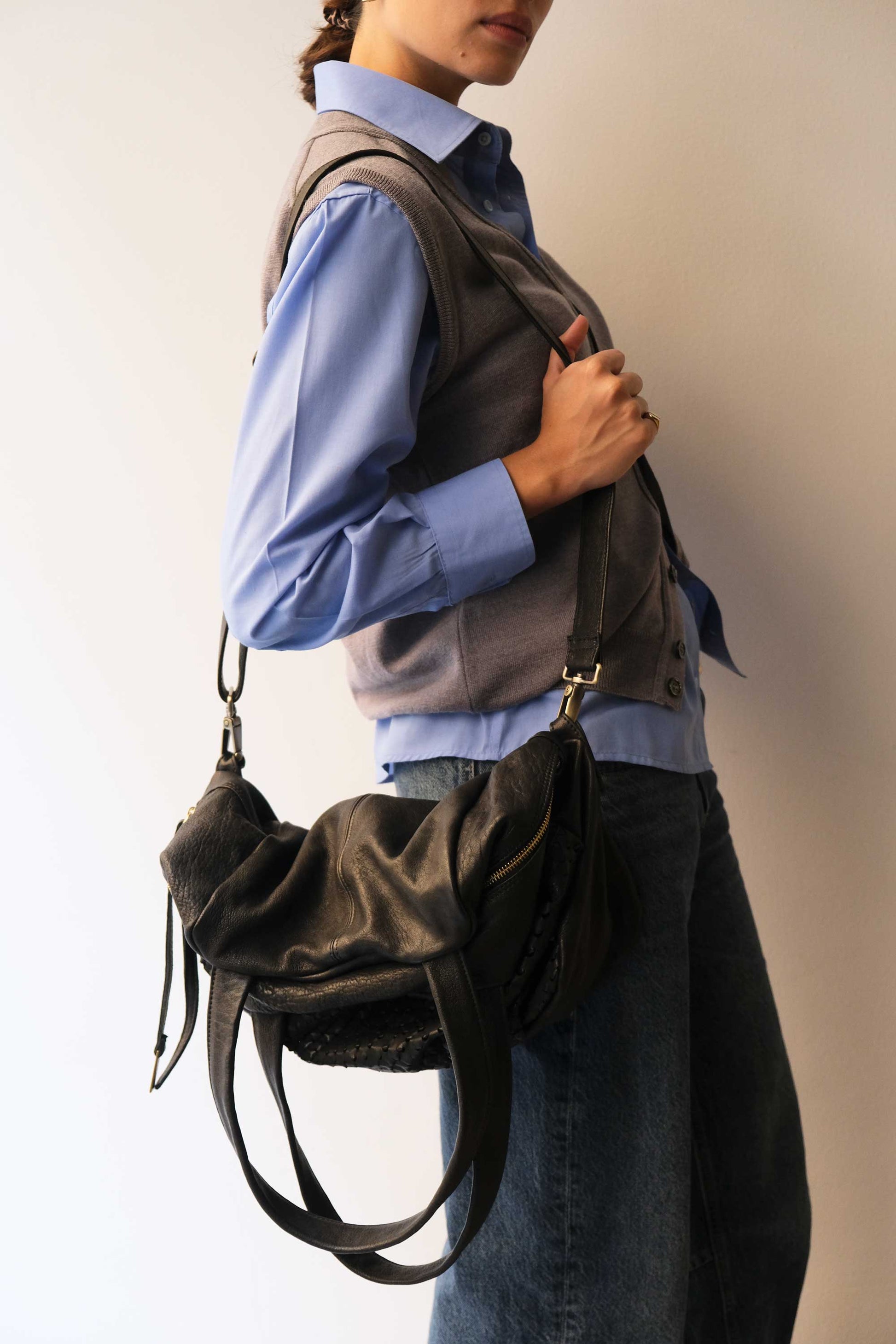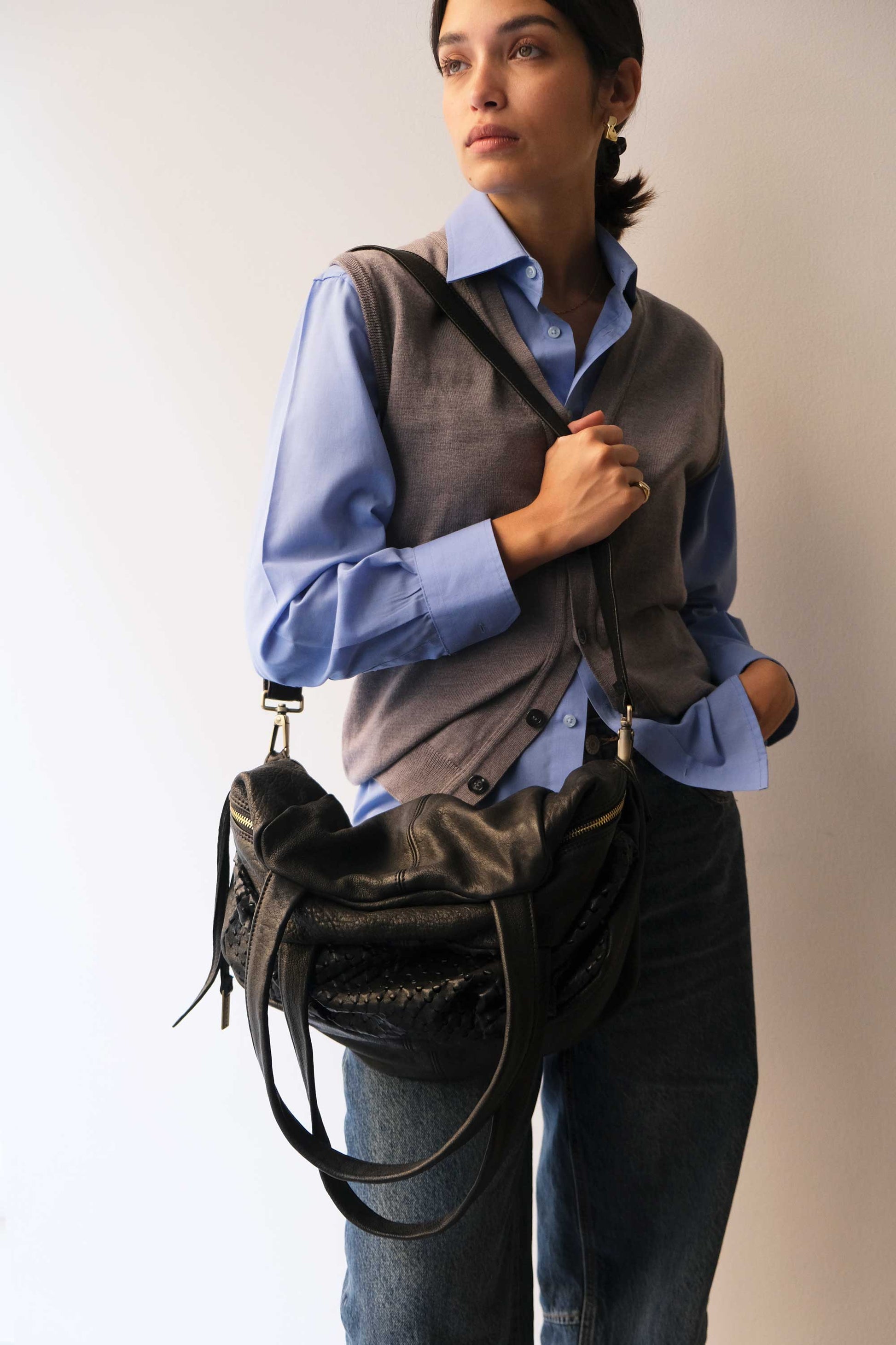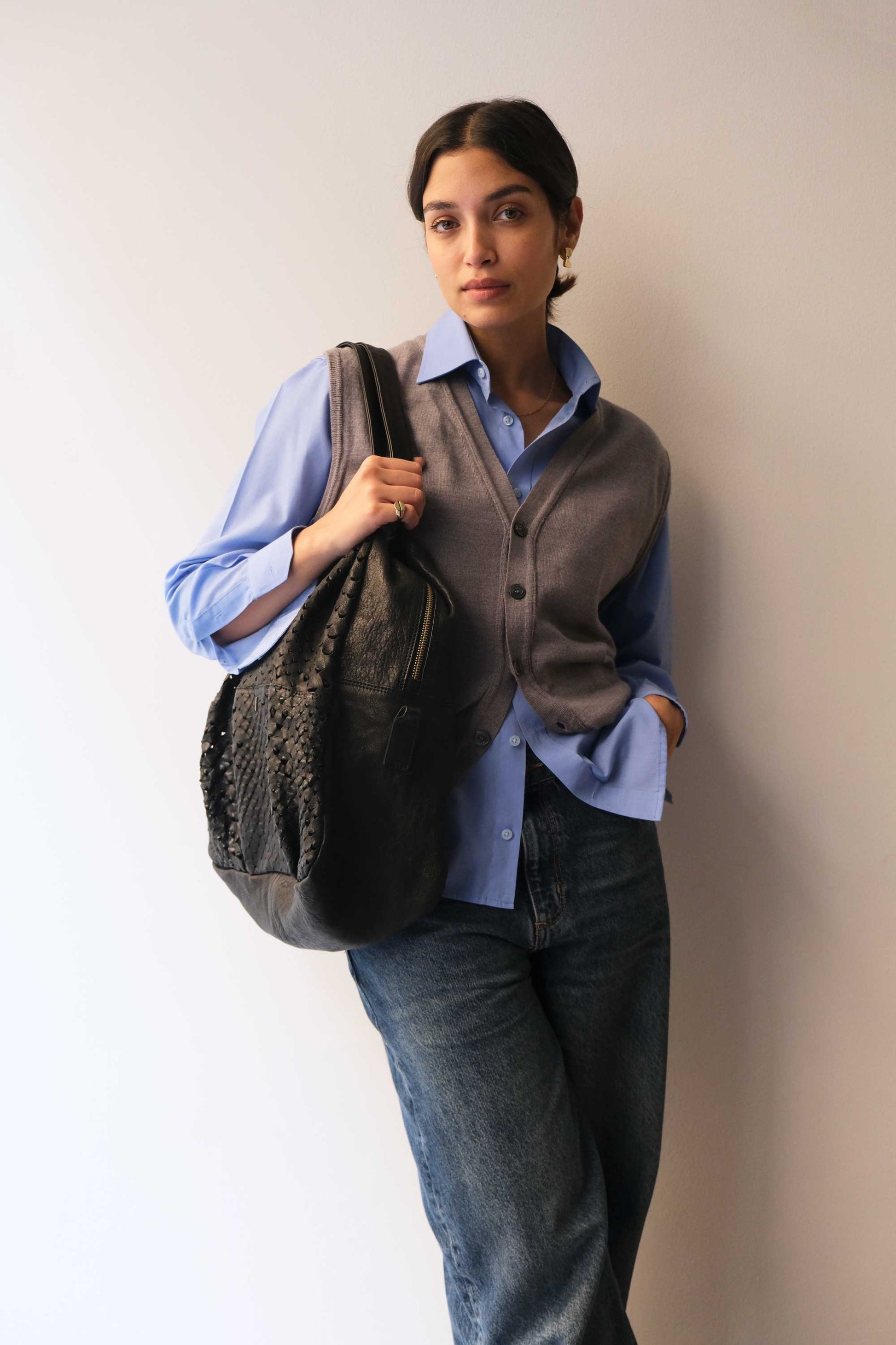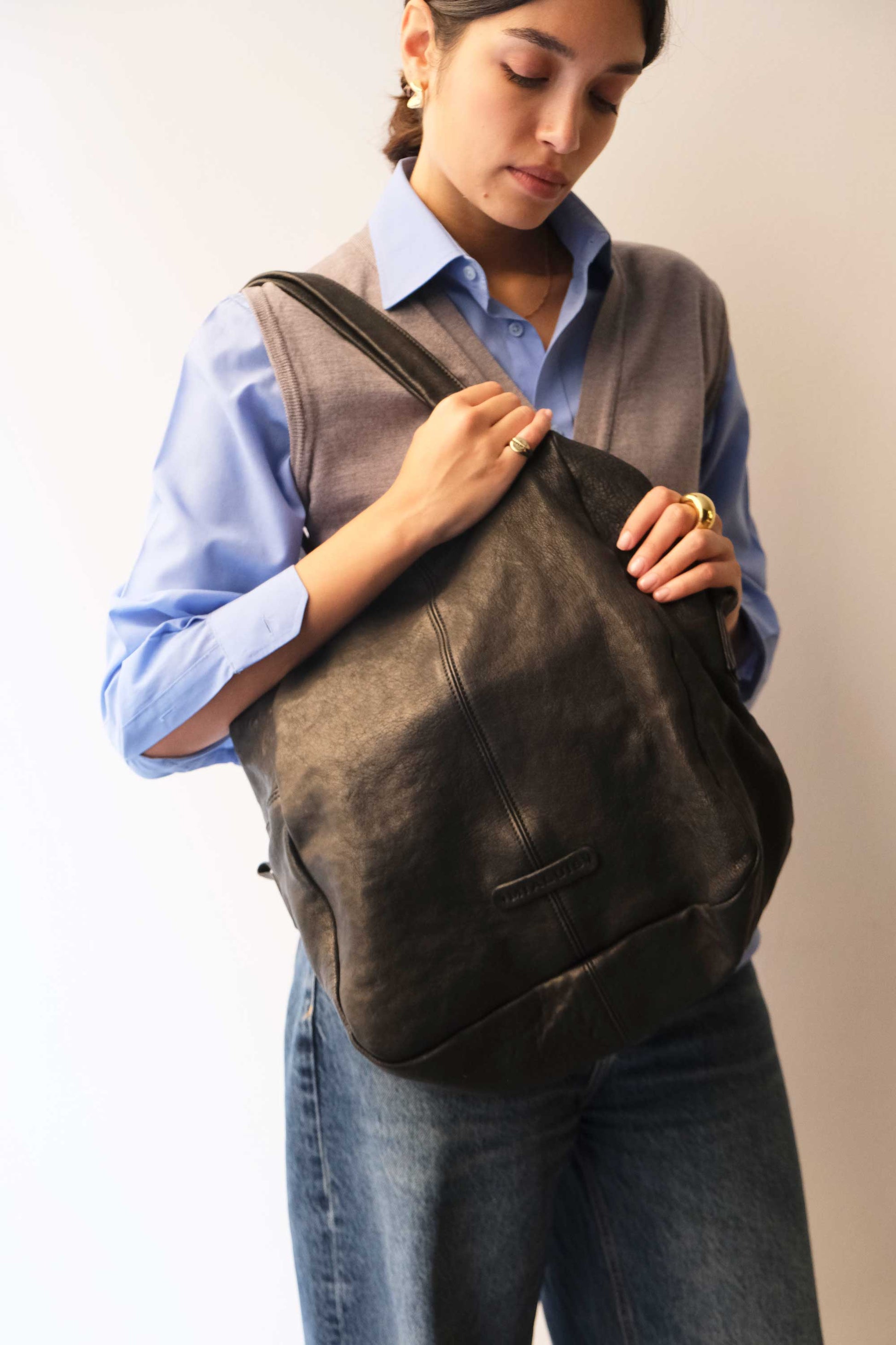 Riri is a very concrete, rational and organized woman. She is a sincere friend. Her essential way of being reminds me of Bruno Munari's design. The soft folds of the bag represent her welcoming soul, while maintaining the rigor of a defined and rational shape.