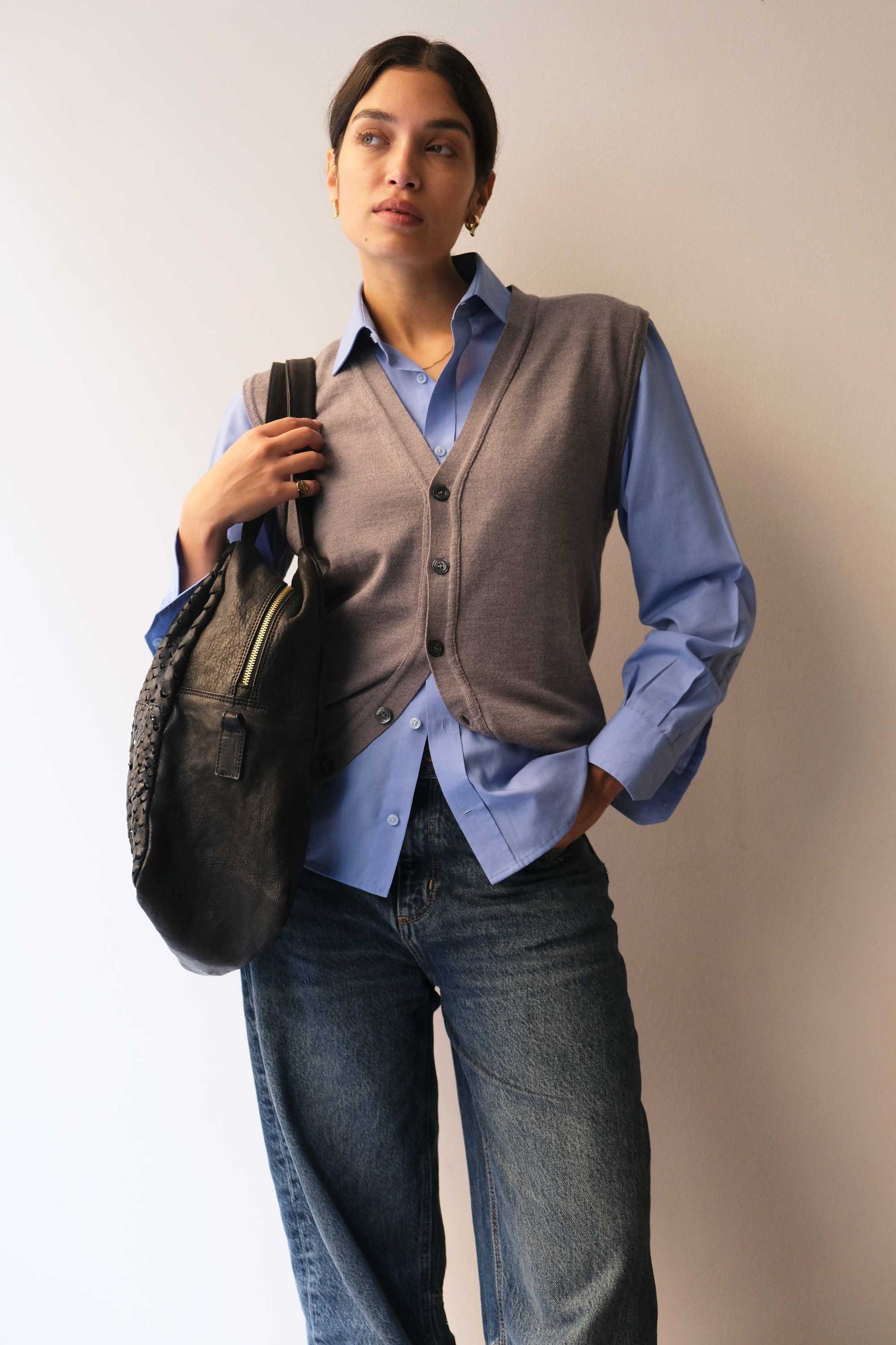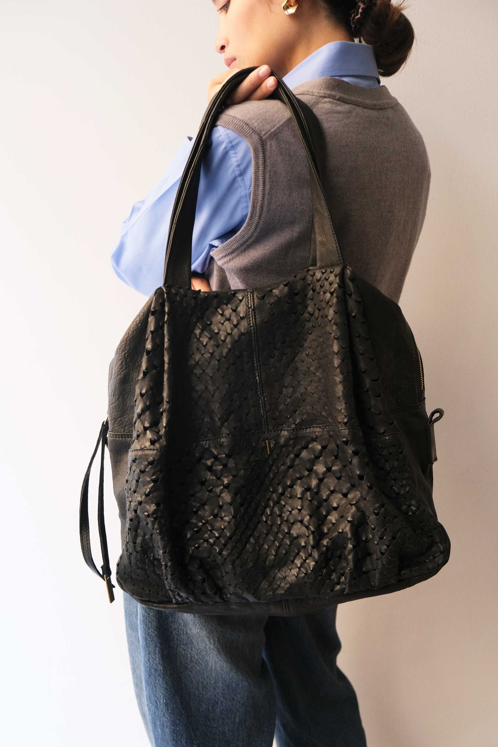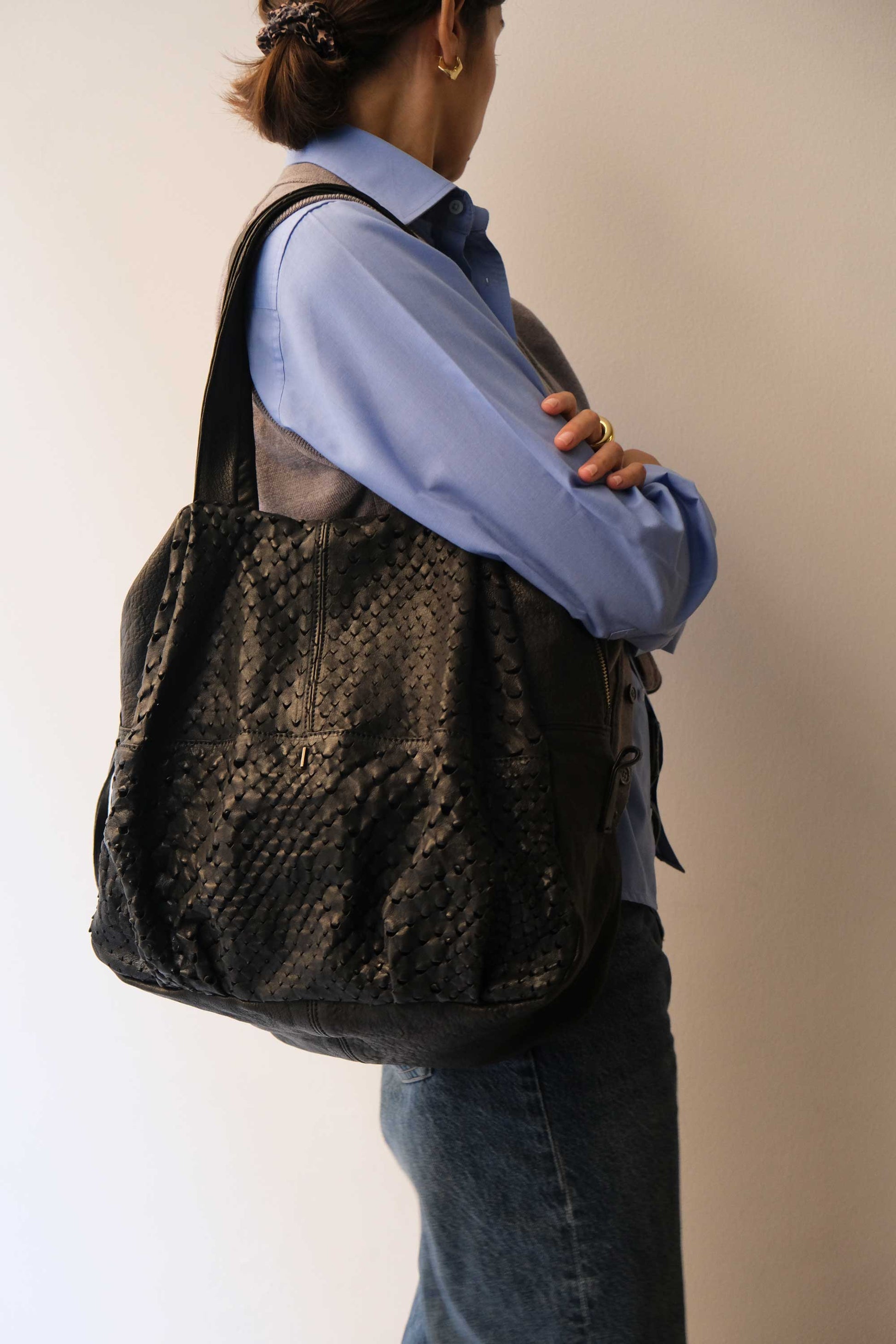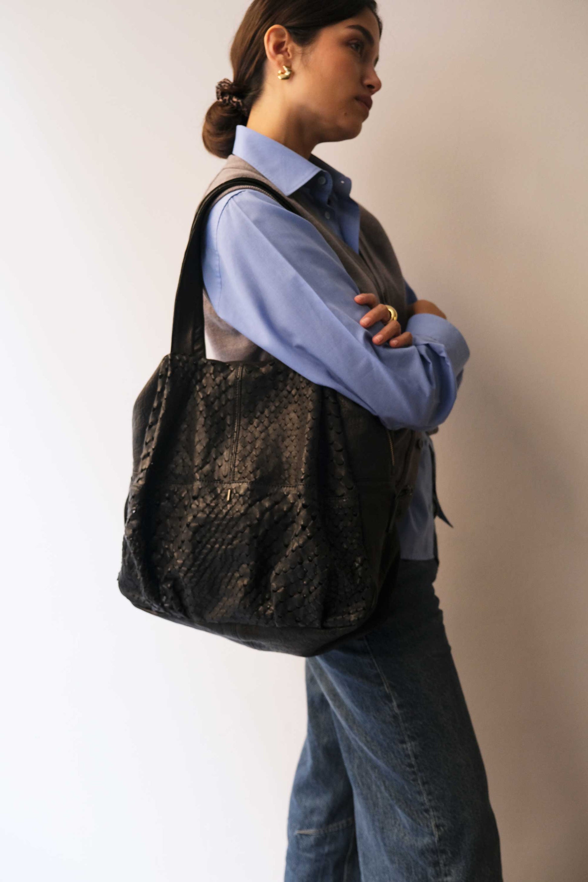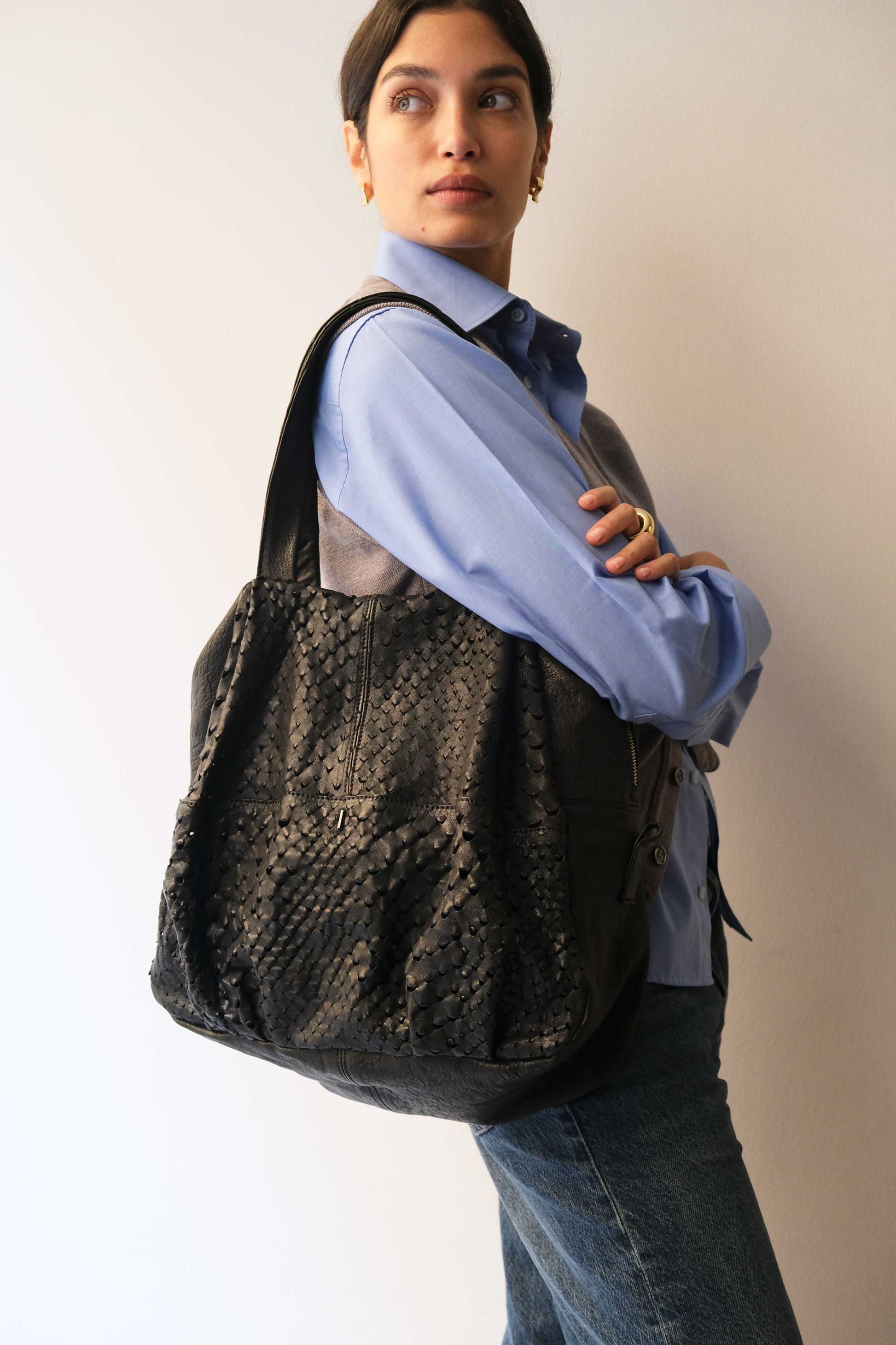Riri is a very concrete, rational and organized woman. She is a sincere friend. Her essential way of being reminds me of Bruno Munari's design. The soft folds of the bag represent her welcoming soul, while maintaining the rigor of a defined and rational shape.