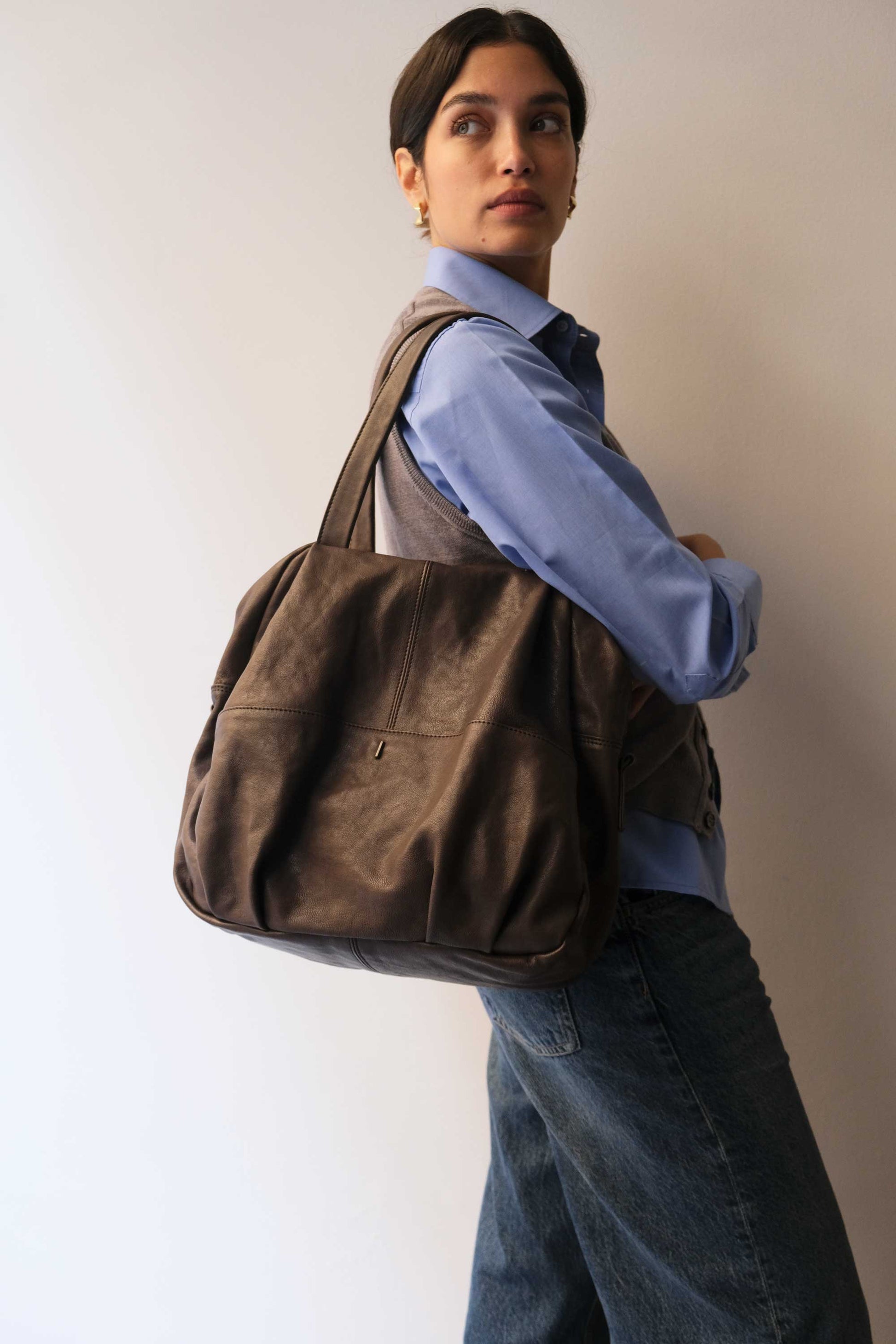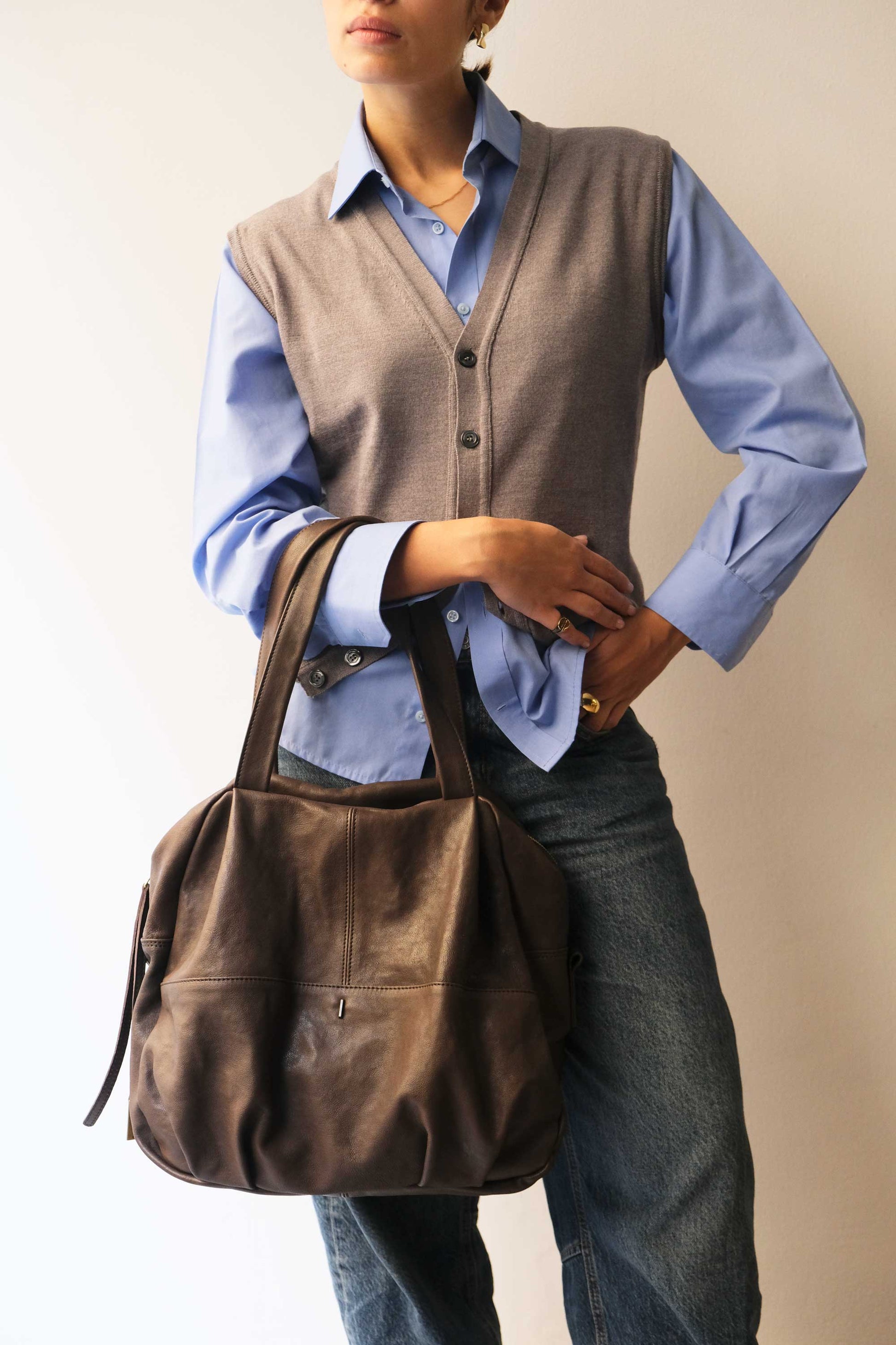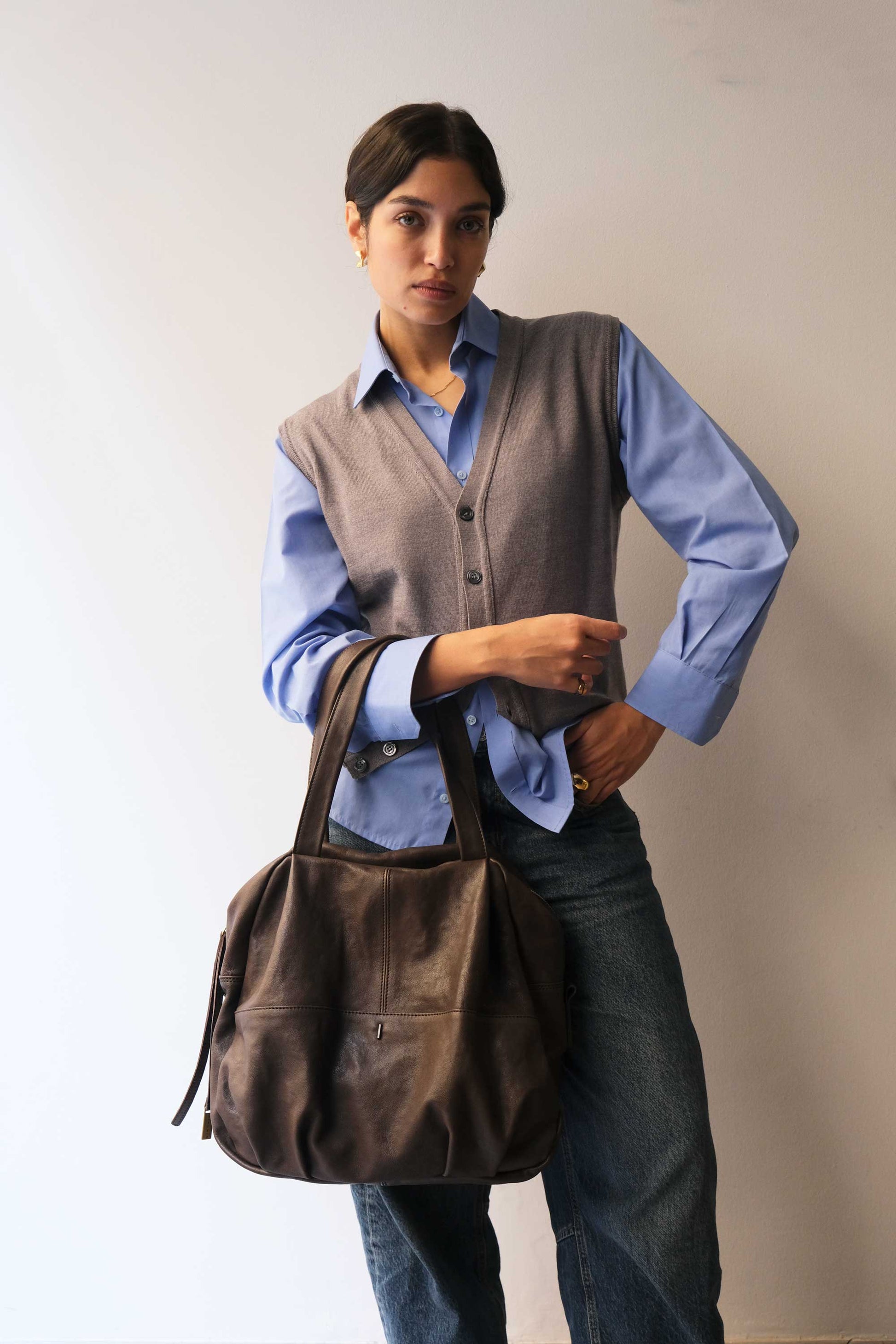 Riri is a very concrete, rational and organized woman. She is a sincere friend. Her essential way of being reminds me of Bruno Munari's design. The soft folds of the bag represent her welcoming soul, while maintaining the rigor of a defined and rational shape.