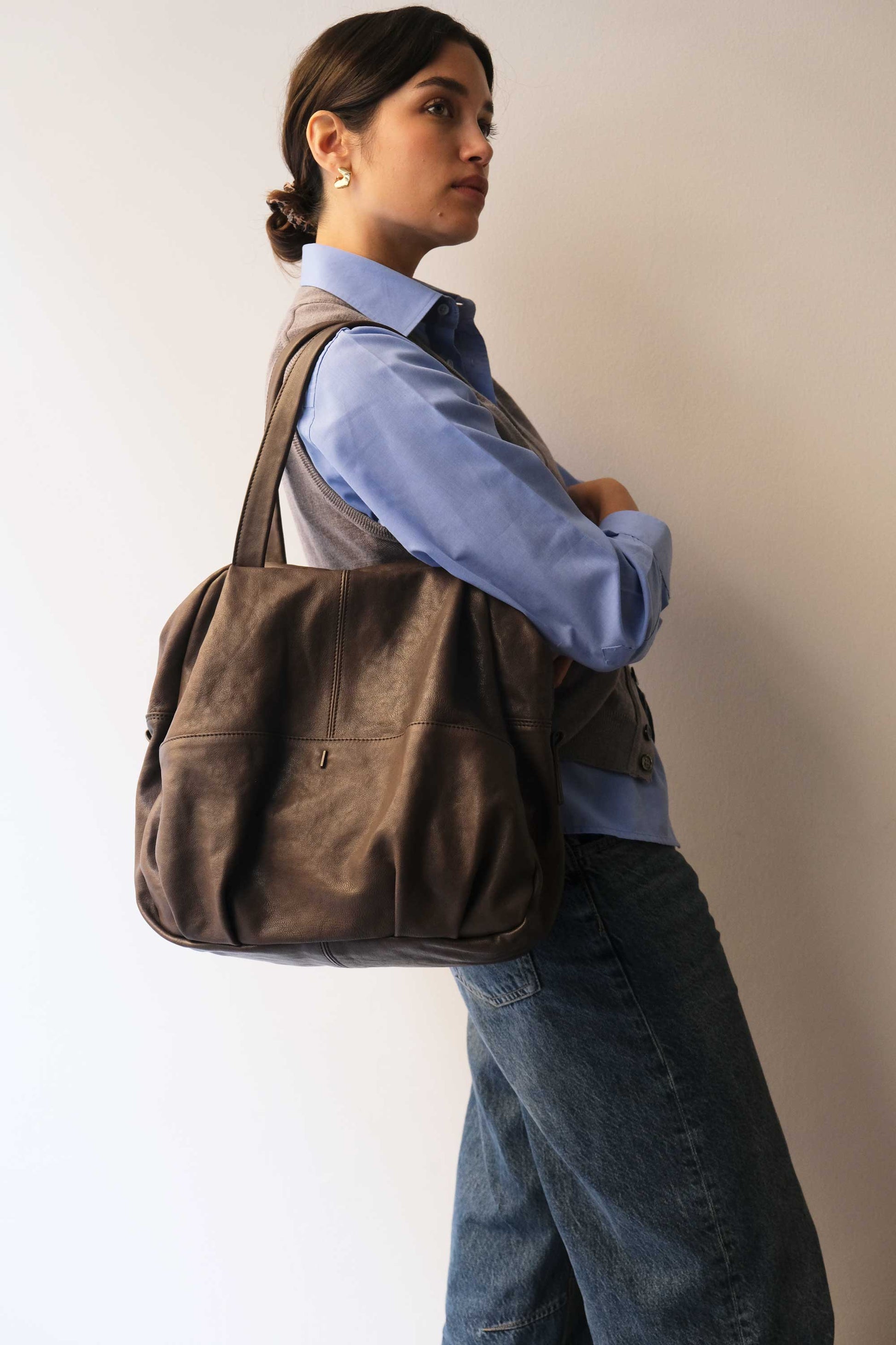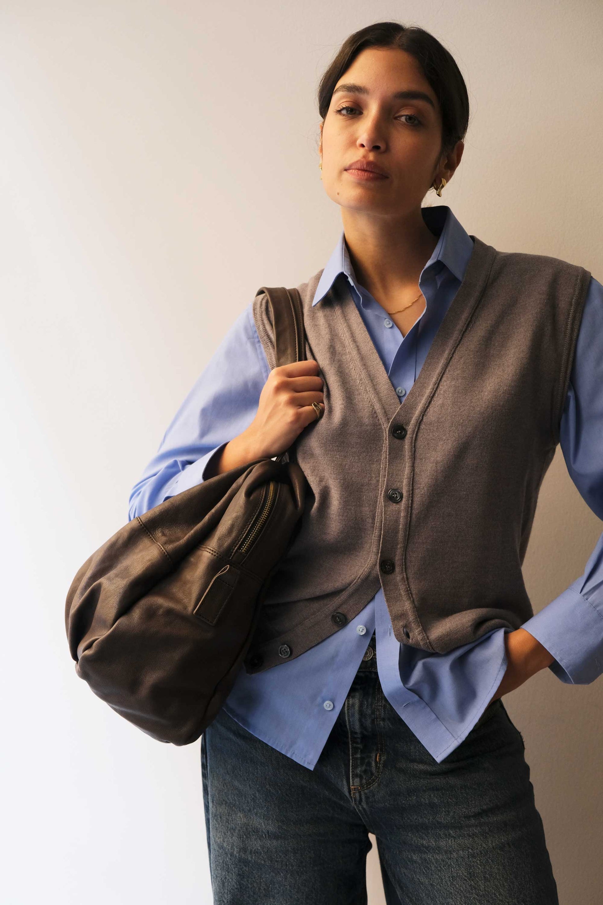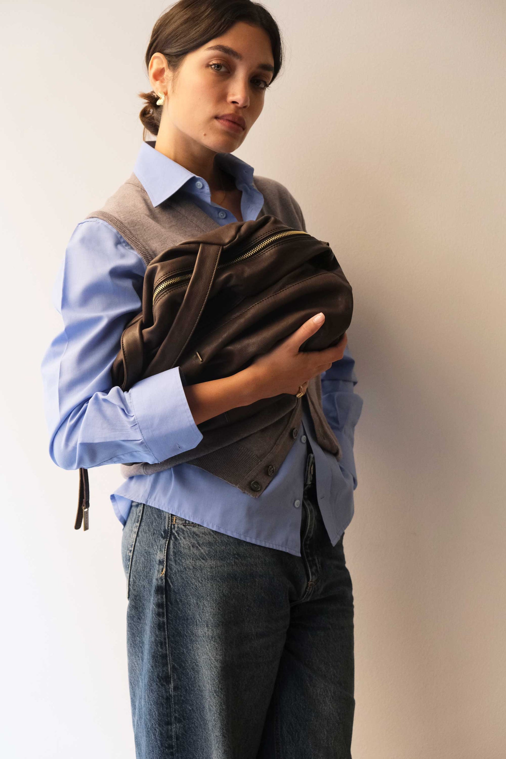 Riri is a very concrete, rational and organized woman. She is a sincere friend. Her essential way of being reminds me of Bruno Munari's design. The soft folds of the bag represent her welcoming soul, while maintaining the rigor of a defined and rational shape.