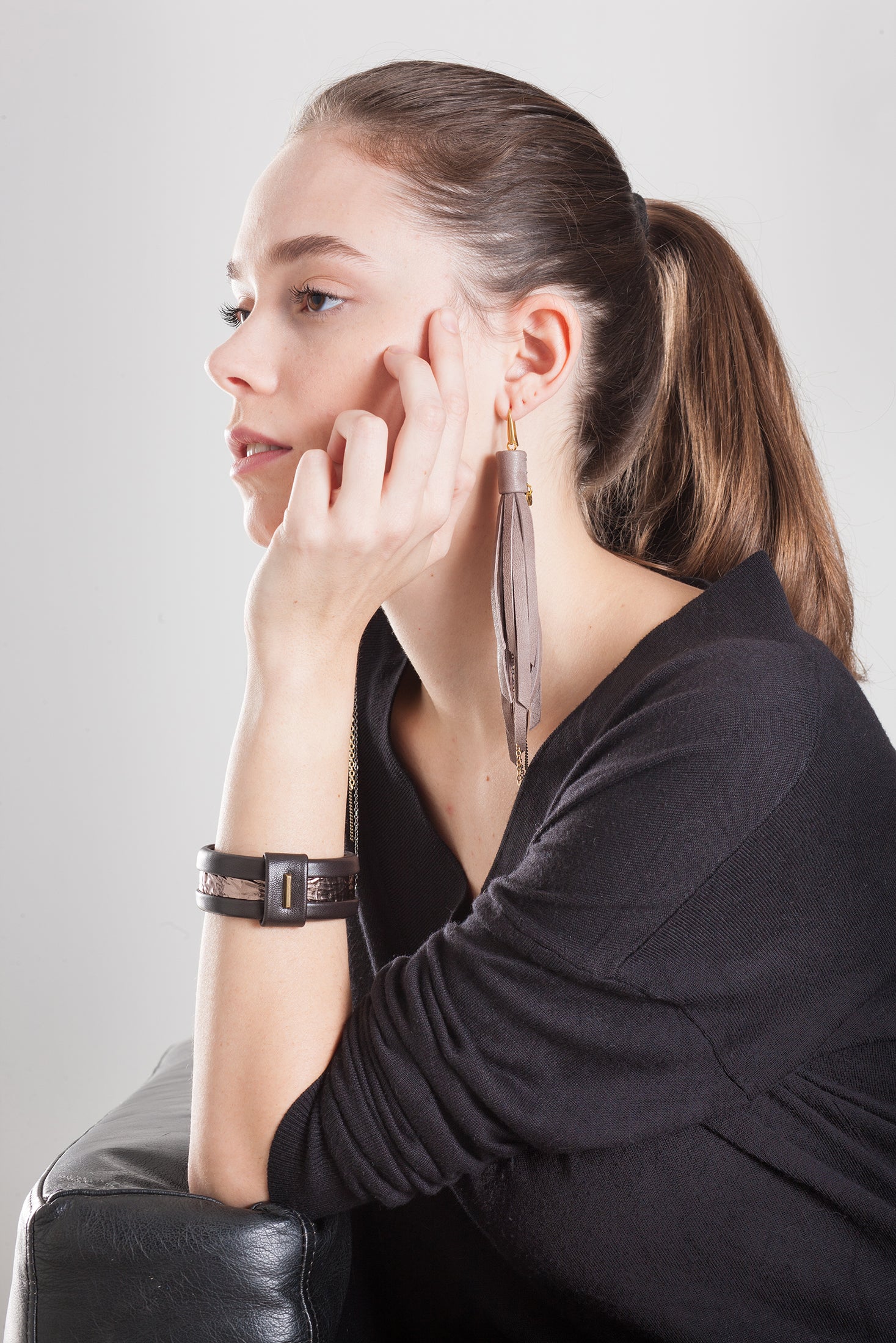 Pendant earrings, made of soft, fine, Italian leather which derives exclusively from leftovers and scraps.